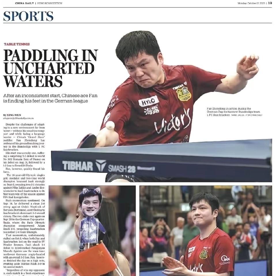 今天央媒都在报道樊振东呢!10月13日《人民日报(海外版)》整版写他德甲的事,战况、人气反响都讲了,还提了他7月凤凰卫视采访里说的旅欧生活,连看英超、西甲都提到了。央视体育也转了全运会粤语宣传片,他打头阵,巴黎奥运那史诗级逆转配《海阔天空》太绝了!他这么优秀,难怪央媒重点报道,一起等他全运再放光彩!