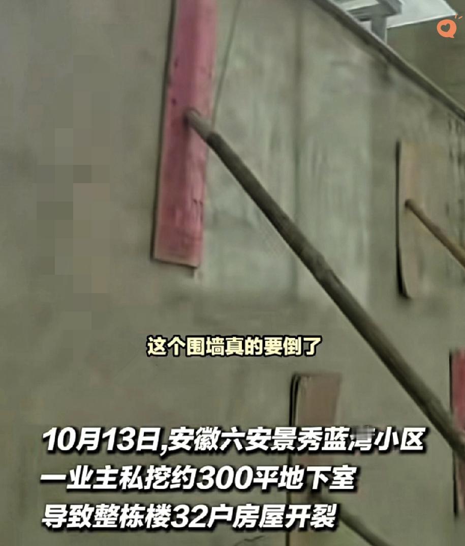 “安徽业主私挖300平地下室致32户开裂”,这哪是装修?分明是拿整栋楼的人命当赌注! 楼上住户说,这家白天开着挖机凿,下半夜偷偷运土,3米高的围栏把猫腻挡得严严实实。 等发现时,顶楼墙面全是横竖裂缝,窗台大理石都断了,鉴定下来整栋楼成了Cu级危房。 最讽刺的是物业那句“没有执法权”,可法律明明要求物业得劝阻、制止还得报告,这眼睁睁看着挖了俩月算怎么回事? 现在挖的人掏钱给了10天安置费,可房子贬值、修复的坑谁来填?律师都说这已涉嫌危害公共安全罪了。 这事儿根本不是“私挖”那么简单,是有人把公共安全当摆设,也暴露了监管的滞后。 你觉得该怎么罚才能守住“楼脆脆”的底线?