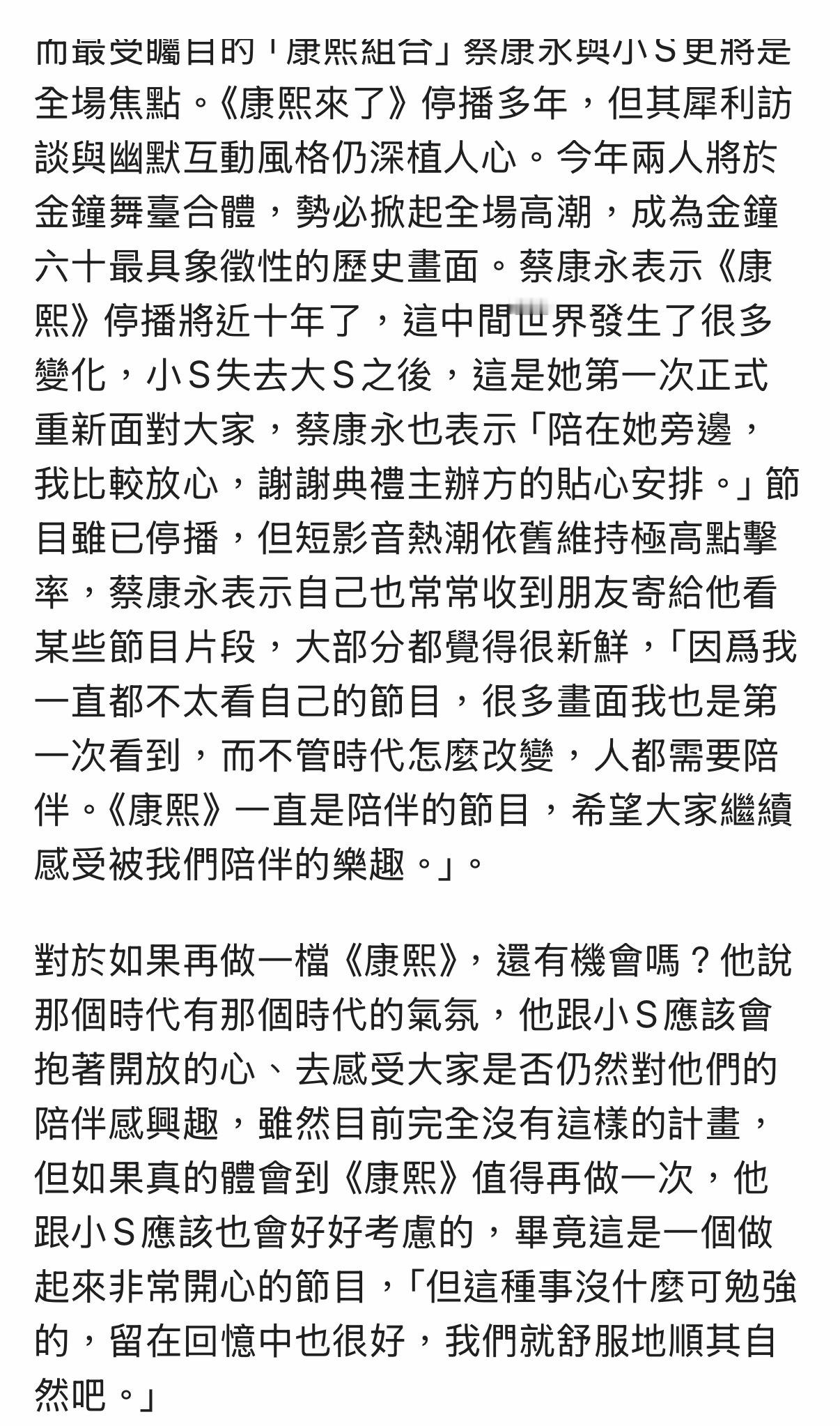 「康熙」蔡康永小S 将在金钟奖合体!暖心的康永哥,康永哥陪着小S真让人安心[捂嘴哭]保佑熙娣