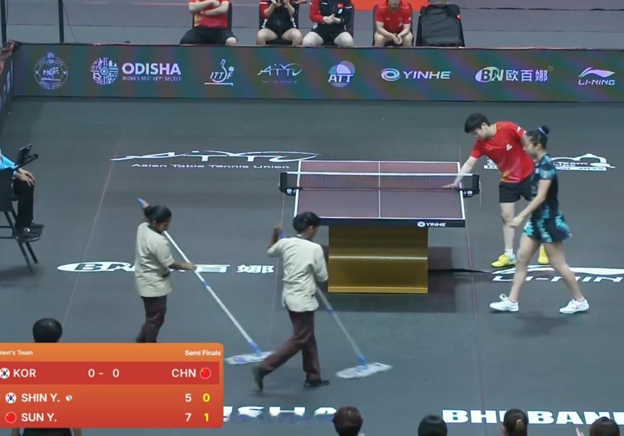 不得不说,印度的办赛能力还是有待提高啊!在中国队和韩国队的亚锦赛女团半决赛比赛开始前,比赛场馆的屋顶漏水了,比赛也因此暂停了一下。但比赛并没有因为屋顶漏水而长时间暂停,很快就开始了。于是孙颖莎和申裕斌的比赛中出现了很神奇的一幕,每当比分到一个阶段两人擦汗后,总有工作人员闯进镜头擦地上的水,非常影响观感。 当然了,影响观众的比赛观感是小事,怕就怕运动员踩到地上的水滑倒受伤。
