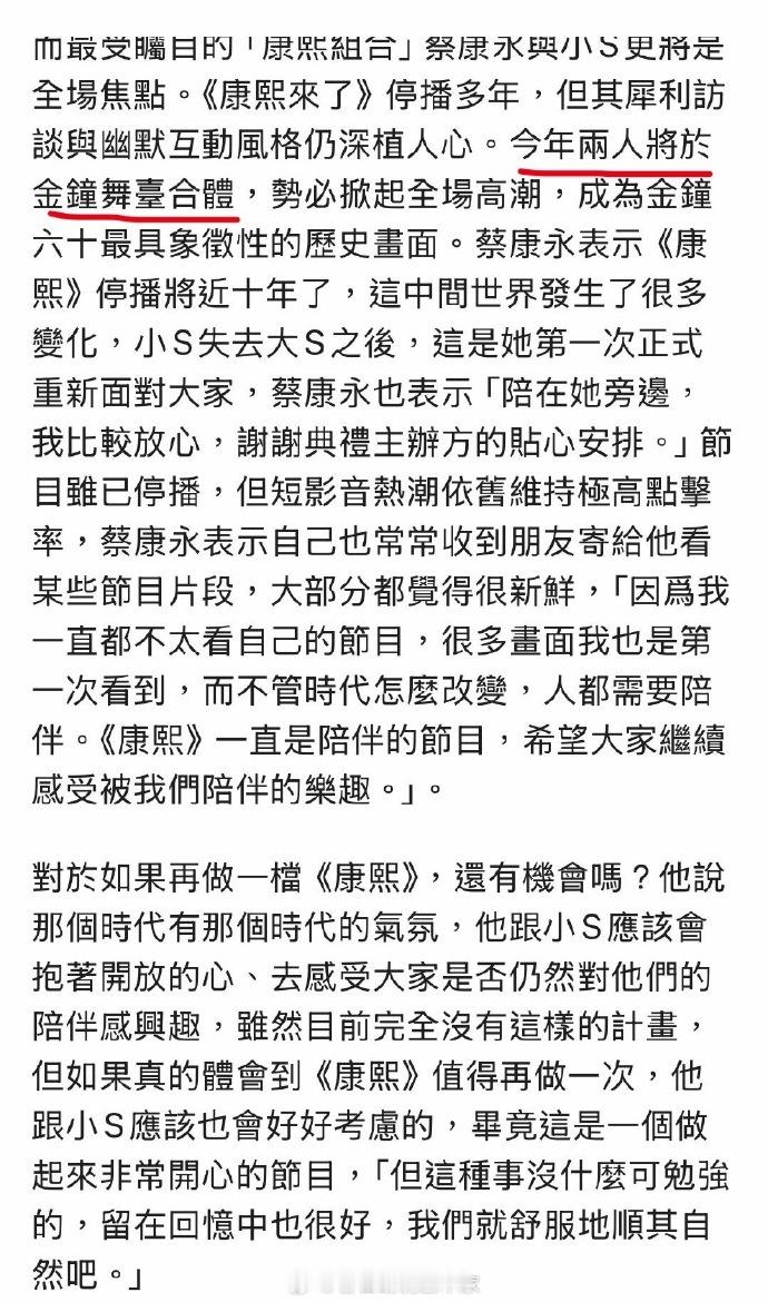金钟奖六十周年之际,小 S 与蔡康永确定合体,他们的出现被视作典礼上最具象征性的历史画面之一。小S蔡康永将在金钟奖合体小S蔡康永金钟奖合体
