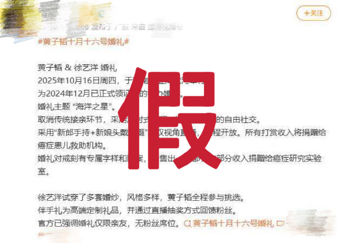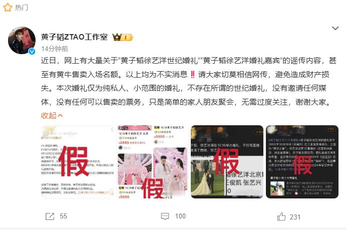 黄子韬徐艺洋被传举办世纪婚礼,黄子韬方对此作出澄清称不存在该说法,同时表示婚礼无需过度关注,避免不实信息扩散。黄子韬方称婚礼无需过度关注黄子韬徐艺洋不存在所谓的世纪婚礼
