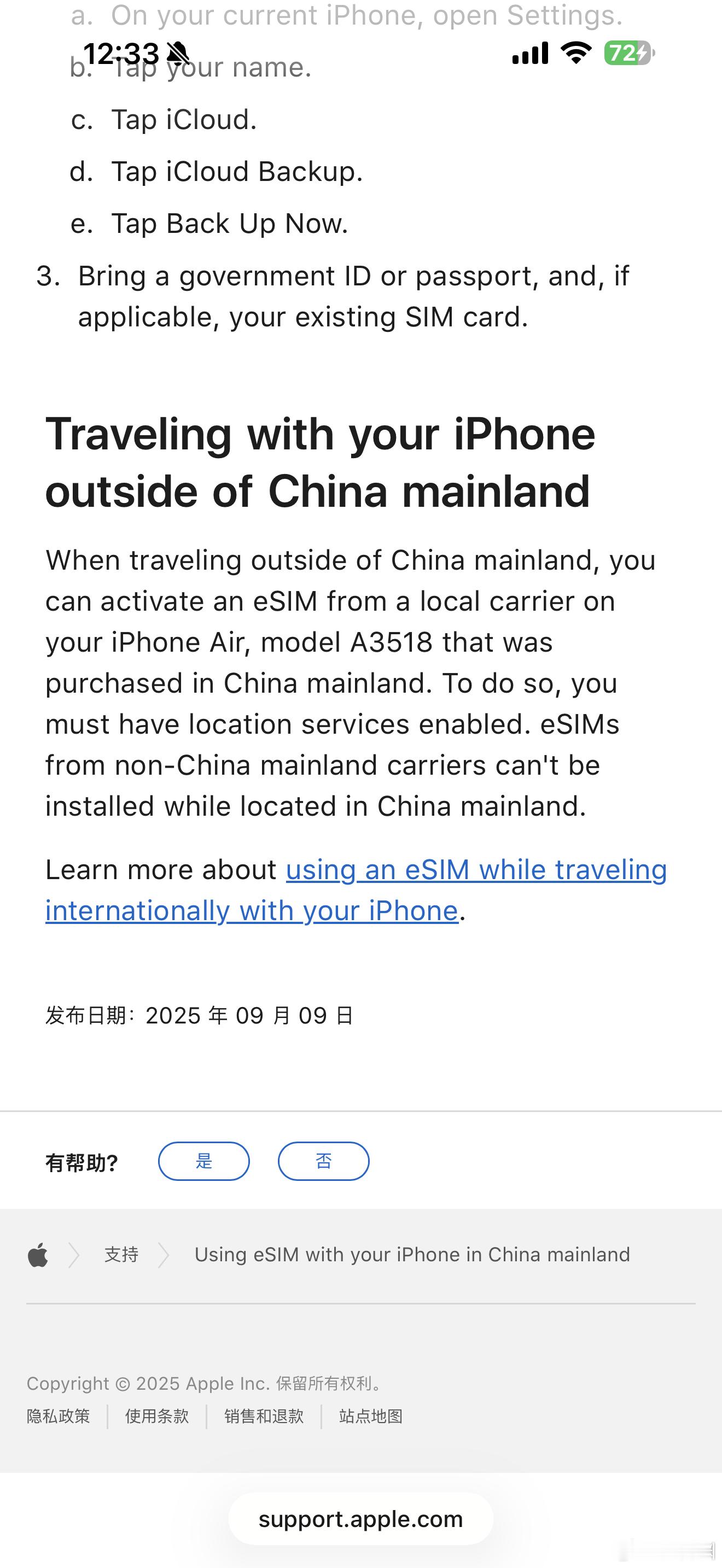 但是国行iPhone Air可以写入香港eSIM,苹果官网写明了,国行iPhone Air出境出国时,可以用当地的eSIM,和插卡版iPhone一样。