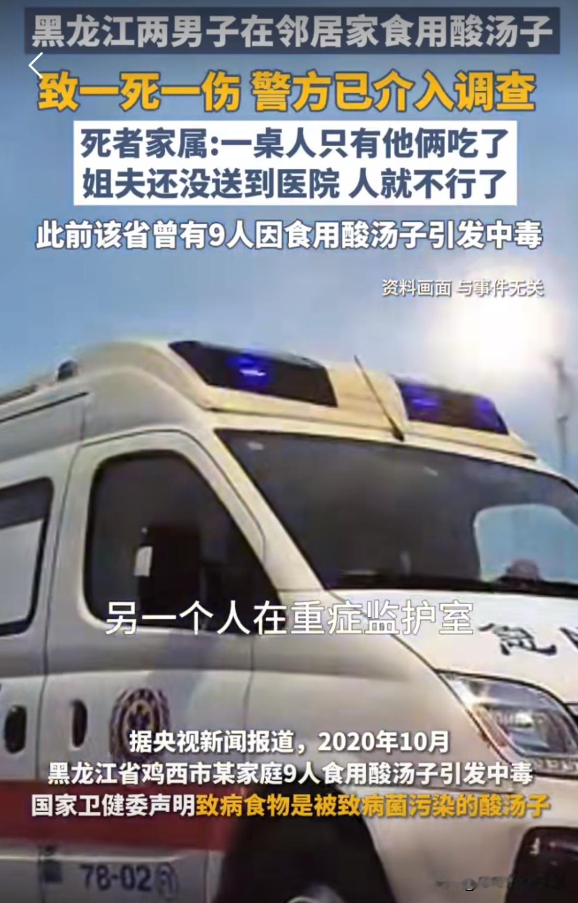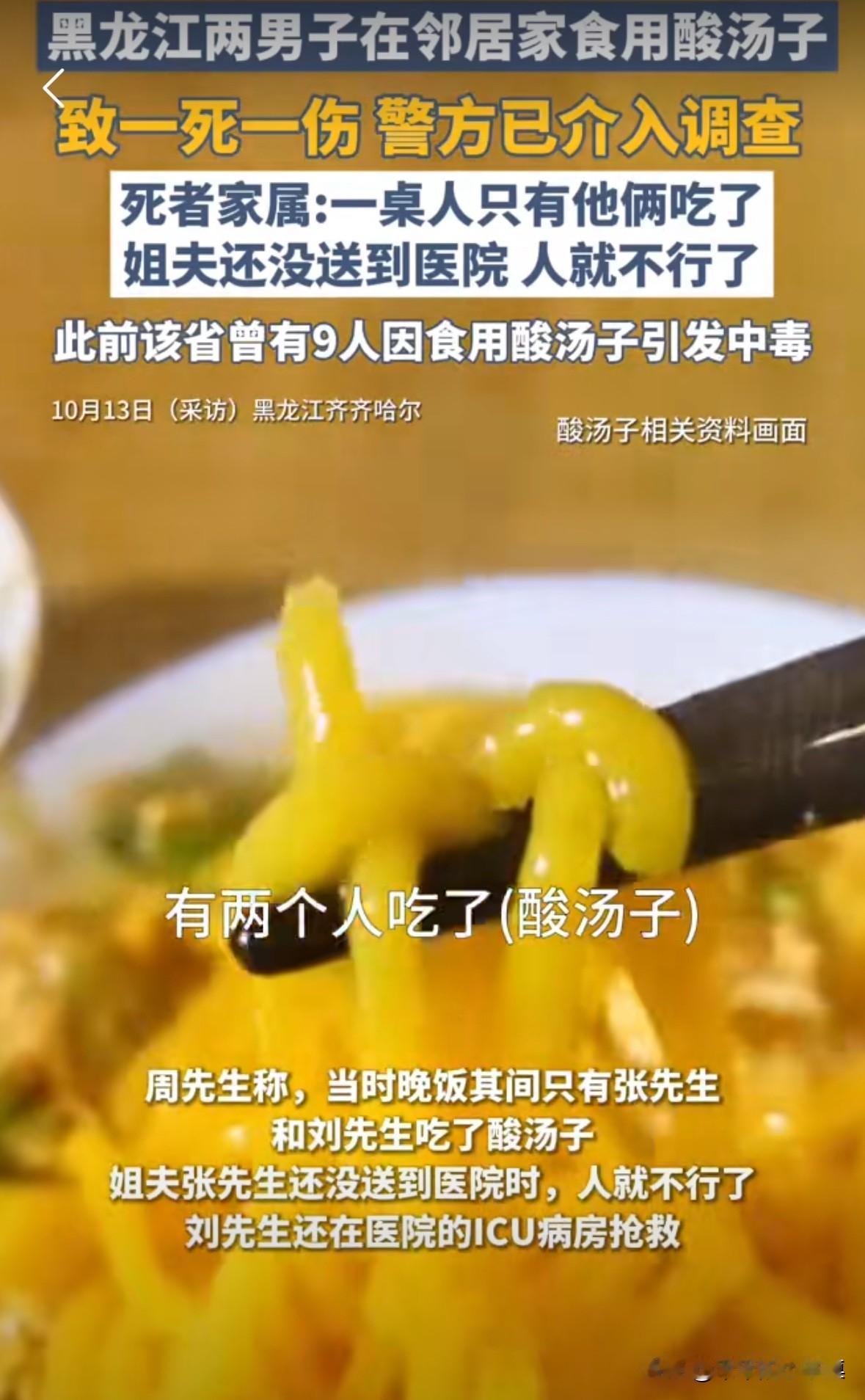 黑龙江两名男子在邻居家吃酸汤子,导致一个死亡,一个在重症监护室。 这一桌聚餐的五六个人只有这两个人吃了,其他人都没吃。 吃完后,家属还没到,人就已经不行了! 所以这种发酵类的东西尽量少吃,只要中间出一点差错,可能就会要命! 我们这边有人吃臭豆腐,一家人都死了,据说是豆腐没有处理好。