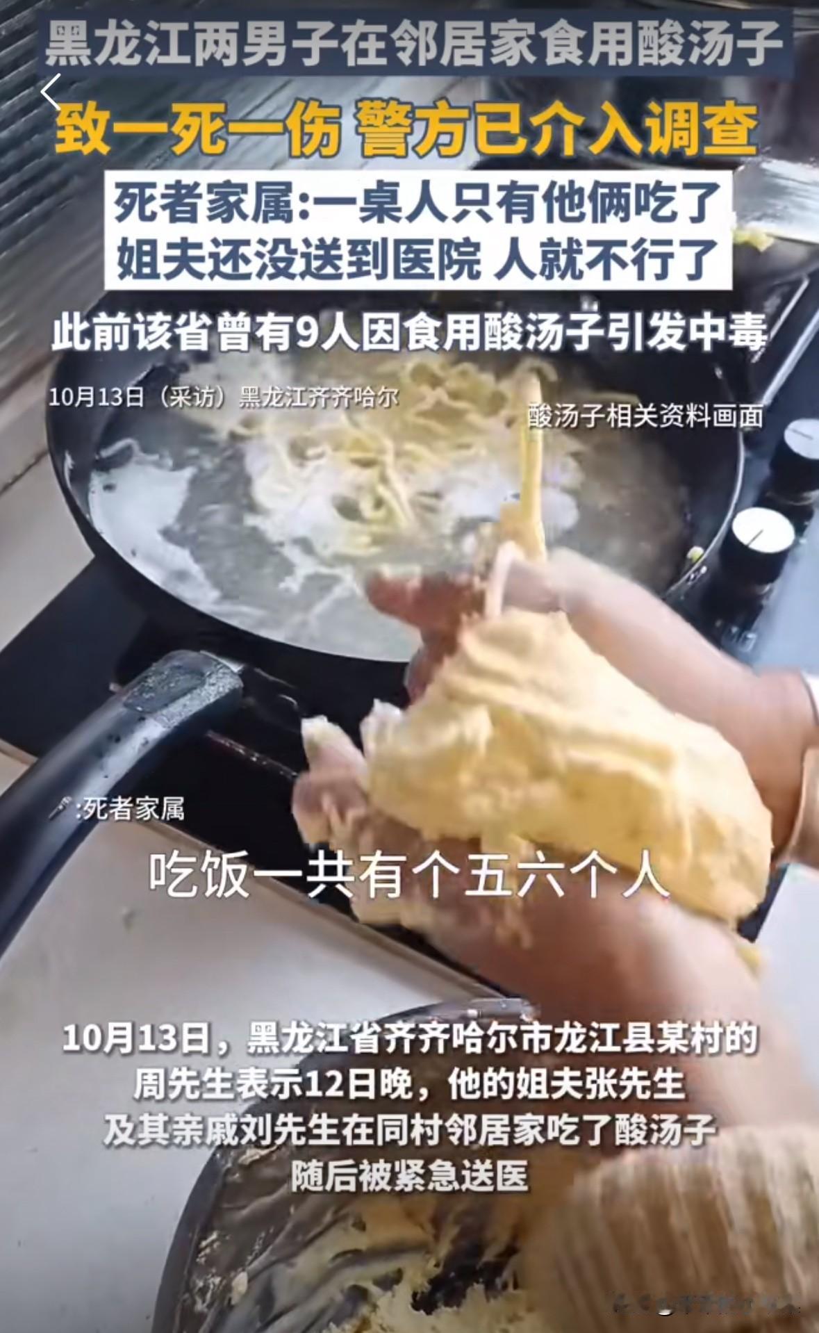 黑龙江两名男子在邻居家吃酸汤子,导致一个死亡,一个在重症监护室。 这一桌聚餐的五