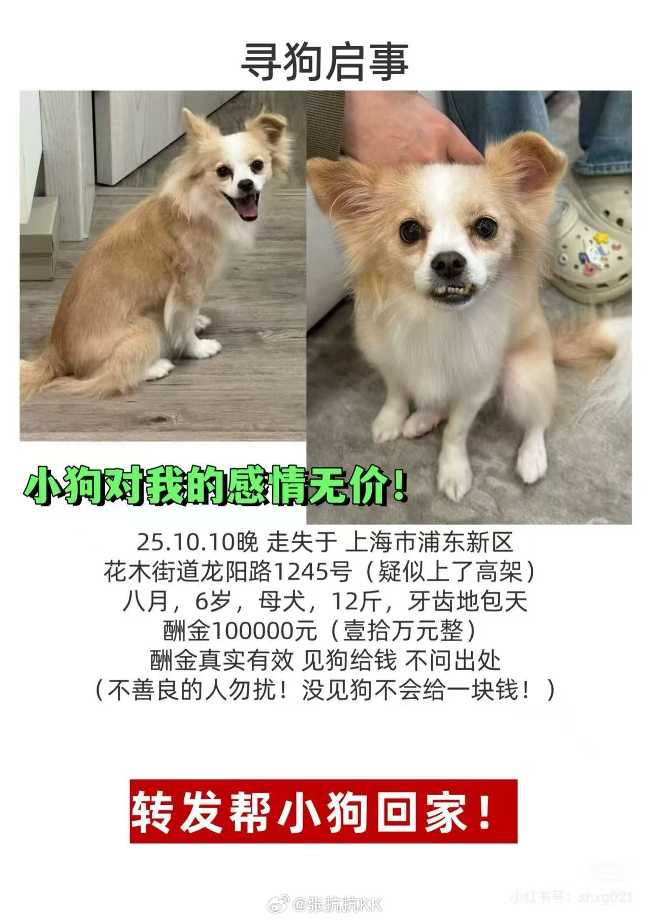 小狗狗走丢上高架了,找到了有酬金。数了一下,五个零!