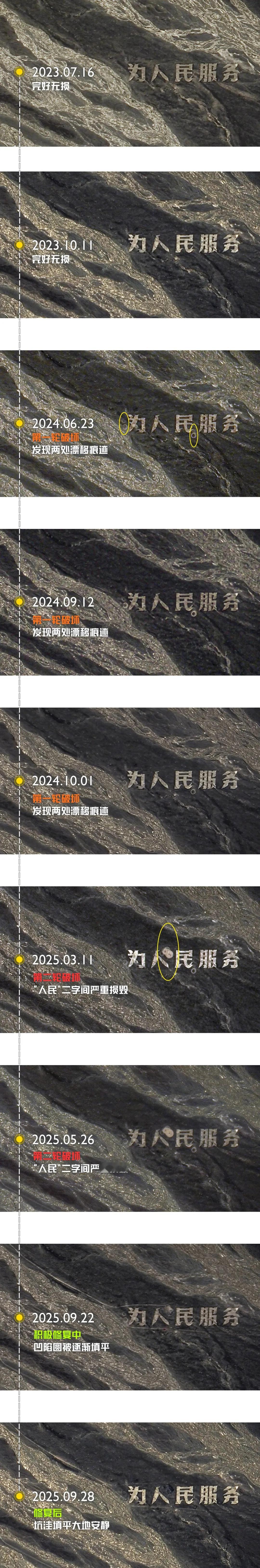 “吉林一号”卫星记录下的“为人民服务” 标语的破坏与重生。(图源:长光卫星官微)[赞]
