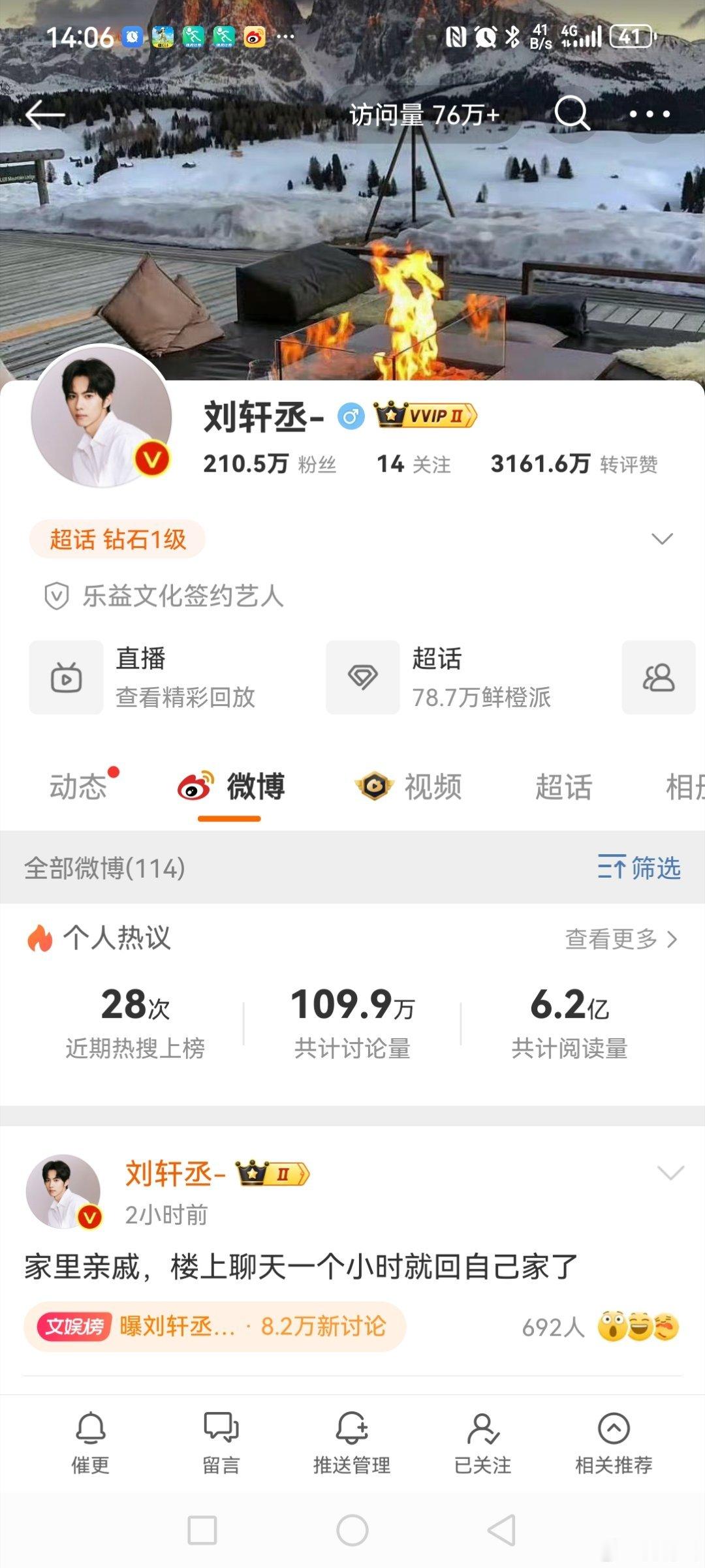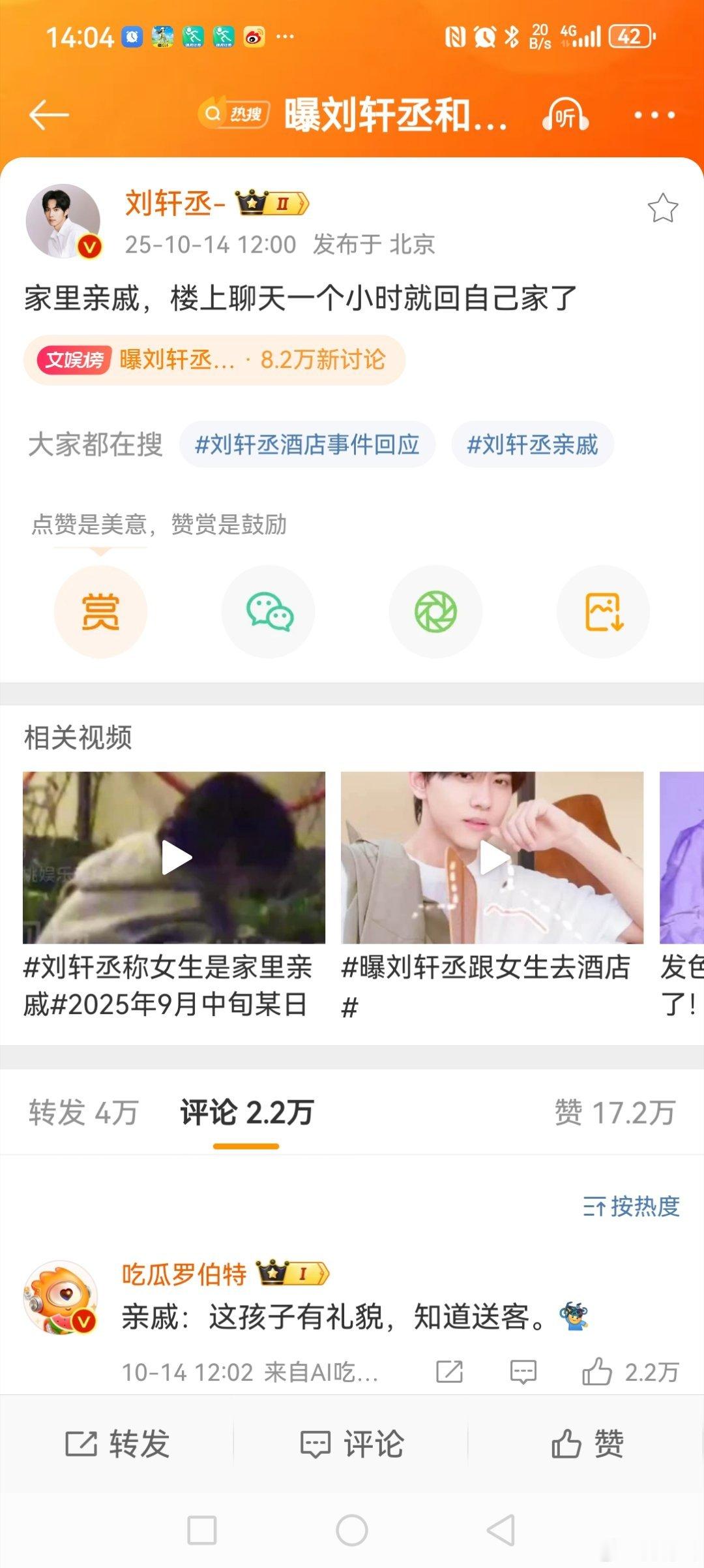 14日中午12:00,发博回应称:“家里亲戚,楼上聊天一个小时就回自己家了。”