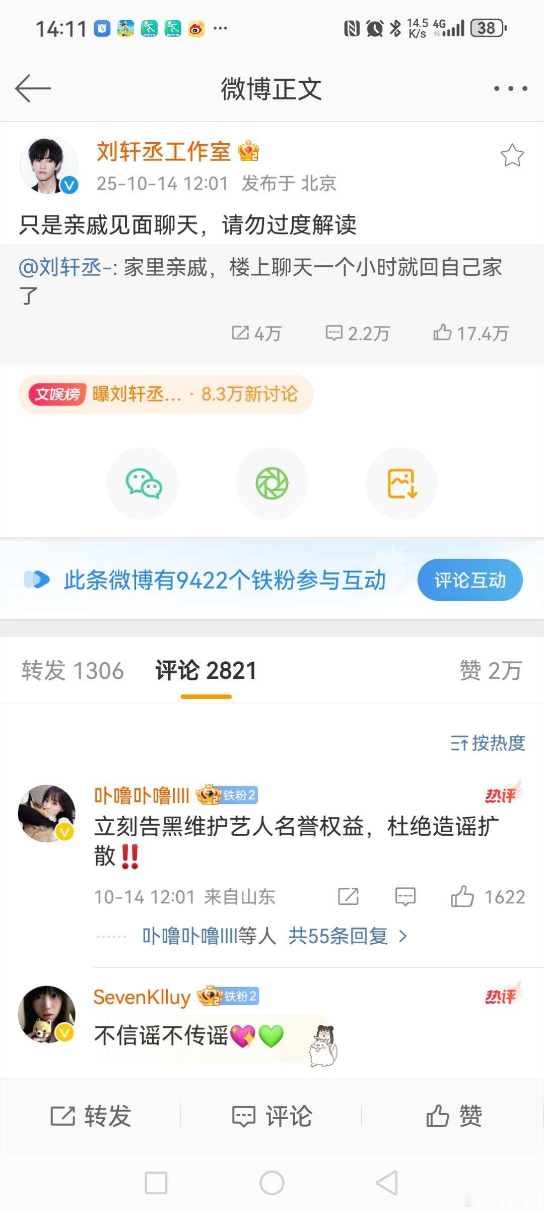 14日中午12:01转发微博并配文辟谣:“只是亲戚见面聊天,请勿过度解读。”