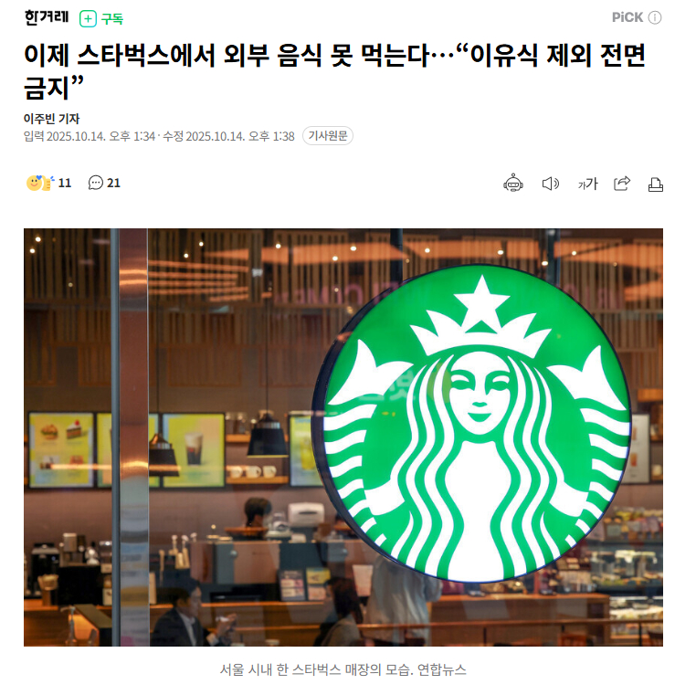 韩国星巴克相关人士14日表示:"自13日起,全国星巴克门店已禁止食用外部食品及饮料。"星巴克门店内已放置"外部食品限制"告示牌,内容为"请在店内享用我们准备的菜单"。婴幼儿的辅食摄取仍被允许。