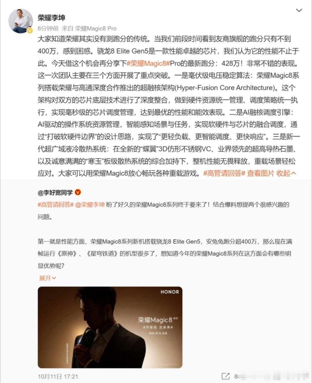 不过话说回来,这次Magic8有这个性能表现我真的一点都不意外。硬件上采用了最新的骁龙8Gen5至尊版不说,还和高通联合研发了“超融核架构”,超强大脑直接动态分配CPU和GPU资源,性能和功耗平衡的妥妥的。除了性能之外,这次Magic8产品力更是全方面升级。聪明的YOYO支持3000+场景自执行,更贴心更懂你;2亿像素超夜神长焦超能打,出门都不用带相机了。明天发布会,估计还有更多惊喜~