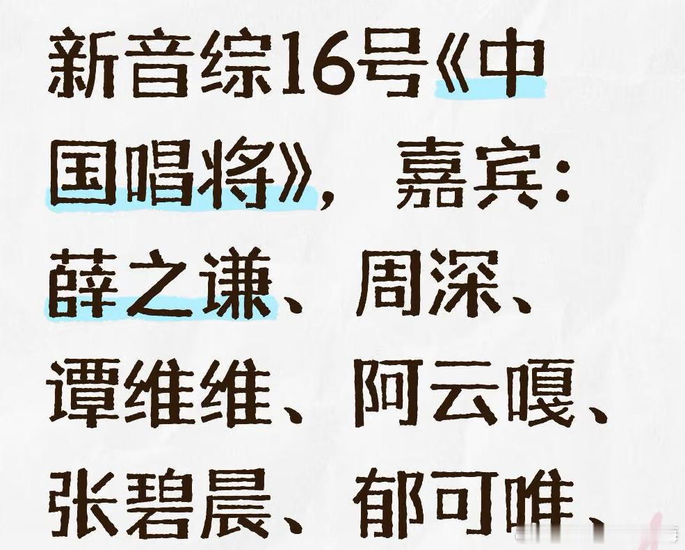 音综16号《中国唱将》,嘉宾:薛之谦、周深、谭维维、阿云嘎、张碧晨、郁可唯等等