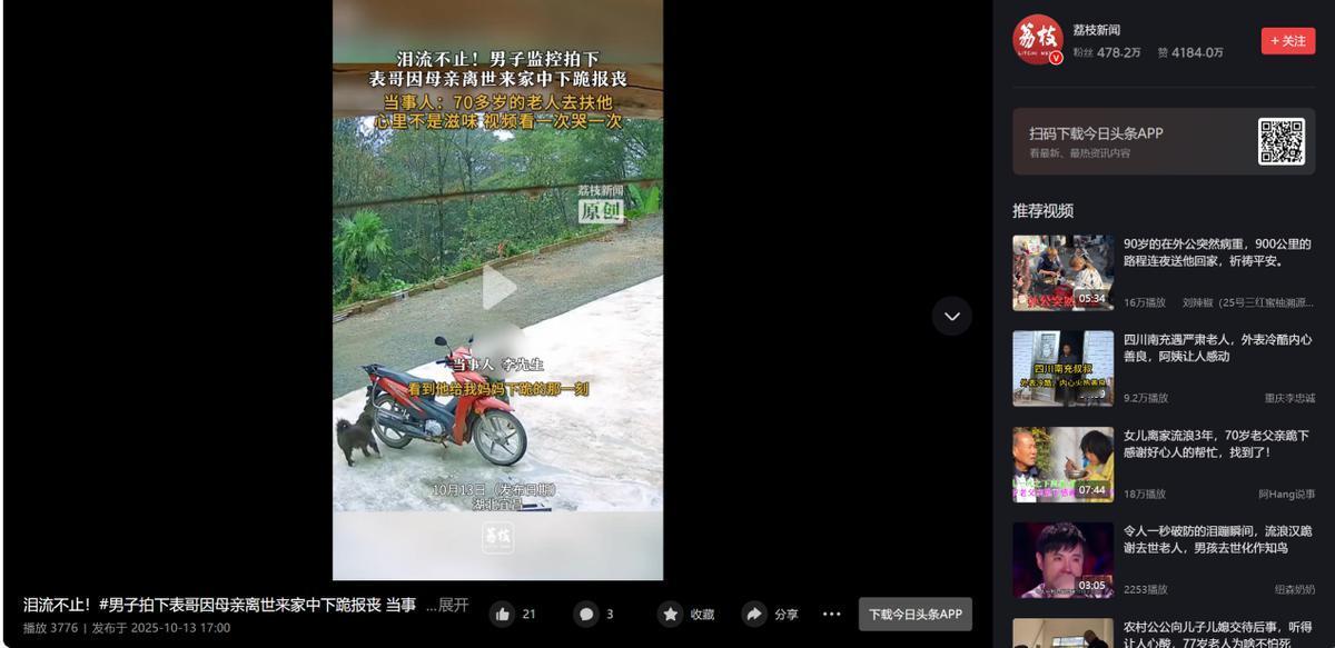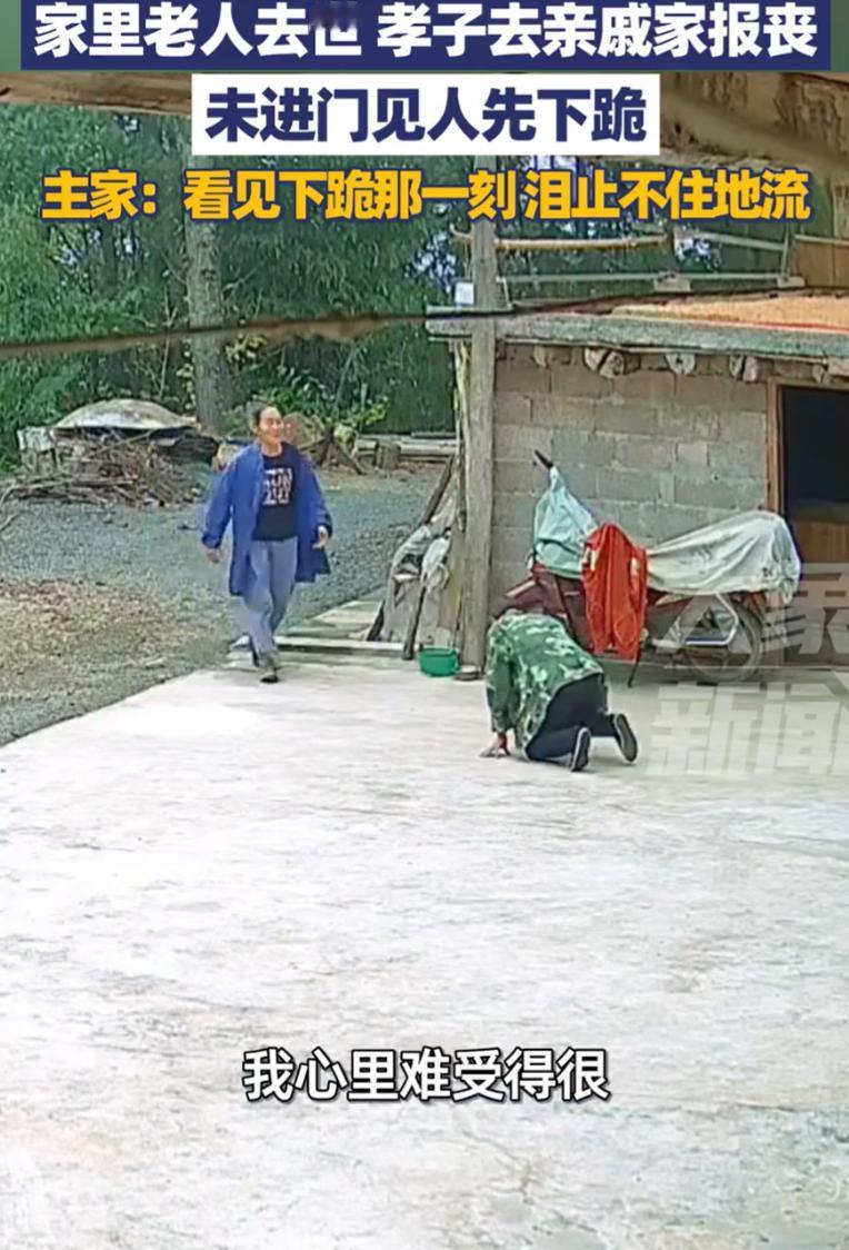“看一次哭一次!”湖北宜昌,一名男子骑着摩托去姨妈家,本以为是寻常的走亲戚,姨妈还在屋里想着是不是侄子特意来看自己,刚准备出门迎接,就看到男子车还没停稳,人已经跪在地上,整个人抖着哭了出来 那是宜昌乡下的寻常一天,天刚过晌午,阳光斜斜地照在院子里,70 多岁的姨妈正坐在堂屋门口择菜,她手里捏着青菜叶子,心里还琢磨着,前几天侄子说最近不忙,说不定会来看看自己。 这孩子打小就跟她亲,每次来都会带点城里买的点心,陪她唠半天嗑,想到这儿姨妈嘴角还带着笑,手里的活儿都快了些,时不时抬头往院门口望一眼,怕错过侄子的身影。 没等多久院外就传来了摩托车 “突突突” 的声音,声音越来越近,听着就像是侄子那辆旧摩托,姨妈赶紧放下手里的菜,拍了拍手上的碎叶,扶着门框慢慢站起来,她腿脚不太好,走快了就容易晃。 可还没等她迈出门槛,就看见那辆满是尘土的摩托车 “吱呀” 一声停在院门口,车还没完全稳住,骑在车上的侄子就猛地滑下来,“扑通” 一声跪在了地上。 姨妈一下子就愣在了那儿,手里还攥着半片青菜叶,她清清楚楚地看见,侄子跪在地上,头微微低着,整个肩膀都在一抽一抽地抖,压抑的哭声顺着风飘进院里,听得人心里发紧。 这哪是平时那个乐呵呵、凡事都扛着的侄子啊?姨妈心里 “咯噔” 一下,刚才的笑意瞬间没了,一股不好的预感顺着脊梁骨往上爬,她也顾不上腿脚疼了,踉踉跄跄地往院门口跑,每走一步都觉得腿上沉得慌。 等跑到侄子身边姨妈伸出手,轻轻碰了碰他的胳膊,刚想问 “咋了这是”,话到嘴边又咽了回去,她看着侄子通红的眼睛,脸上还挂着泪,身上的衣服沾着一路的尘土,显然是急急忙忙赶过来的。 不用问姨妈也大概明白了,肯定是家里出了天大的事,不然孩子不会这样,她没多说一句话,只是蹲下身,用尽全力扶住侄子的胳膊,想把他拉起来,可侄子哭得更凶了,身子抖得更厉害,怎么也起不来。 姨妈也跟着掉眼泪,手紧紧攥着侄子的胳膊,生怕他摔着似的,两个人就这么在院门口,一个跪着哭,一个蹲着陪阳光照在他们身上,却没半点暖意。 后来才知道侄子是来报丧的,家里老人走了,这一路他从家里骑摩托赶过来,心里又慌又痛,硬撑着一口气,就怕半路上掉链子,可一到姨妈这儿,看到熟悉的院子、熟悉的人,那股硬扛着的劲儿一下子就垮了。 在长辈面前,他不用再装坚强,不用再当那个 “顶梁柱”,所有的委屈和痛苦都顺着眼泪淌了出来,而在咱们宜昌乡下,遇上这种大事,上门报信时跪下来哭,是老辈传下来的规矩,不是故意要哭给谁看,是用最郑重的方式,告诉亲人 “家里出事了”,也是在悲痛里,找一个能卸下重担的出口。 更让人心里不是滋味的是,这一幕刚好被院子里的监控拍了下来,姨妈的儿子也就是男子的表哥,在外地工厂打工,平时想妈了就会打开手机看家里的监控,看看院子里的动静,听听妈说话的声音。 那天他刚好午休,习惯性地打开监控,想看看家里怎么样,结果一打开就看到了院门口那一幕,他看着弟弟跪在地上哭,看着妈慌慌张张跑过去,心一下子就揪紧了,眼泪瞬间就下来了,手里的手机都差点没拿稳。 他在千里之外的宿舍里,看着屏幕里的亲人,却什么也做不了,只能对着屏幕掉眼泪,急着跟工头请假想赶紧回家。 现在每次刷到这段视频,还是会忍不住掉眼泪,不是矫情是真的懂那种滋味,在亲人面前,所有的坚强都能碎成渣,在离别面前再多的准备都不够,也总想着要是有空,就多回家看看,多跟长辈唠唠嗑,别等错过了才后悔,毕竟啊能好好见一面,能好好说句话,就是最难得的缘分了。 (信息来源:荔枝网)