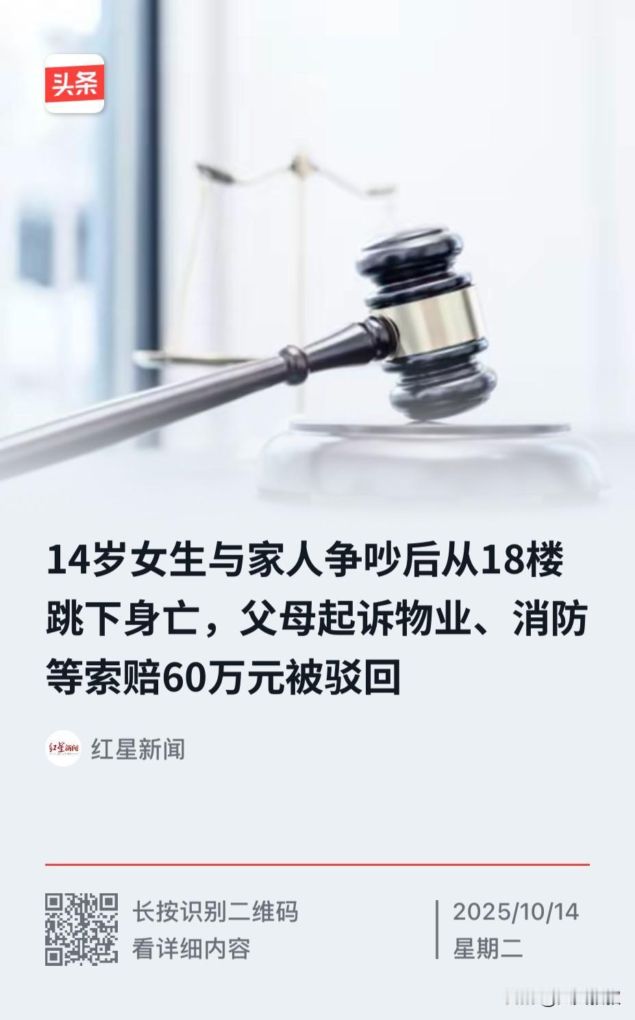 青海海西,一14岁女生在家没写作业,被父母凶了一顿后又把孩子手机给砸了,女生生气的跑出了家门后,直接从小区的18楼跳了下去,事发后,女孩父母认为这是物业的责任,于是将物业告上了法院索赔60万元。 张先生和妻子刘女士有一儿一女,可谓是儿女双全,不过,因为俩孩子学业问题,夫妻俩却没少操心。 虽然在物质层面,张先生两口子对俩孩子可谓是有求必应,无论是穿的还是戴的,都是挑最好的,就连手机也都给孩子配好了。 即便如此,大女儿总是因为玩手机不写作业和张先生两口子吵架,事发当晚,双方又因为玩手机没写作业的问题发生了矛盾,刘女士一气之下,直接把手机给砸了。 看到手机被砸后,大女儿张某便跑出了家门,因为担心女儿安全,刘女士让儿子去找一下姐姐。 没想到,弟弟刚在楼顶看到姐姐时,姐姐就从楼顶18楼跳了下去,导致张某当场身亡。 事发后,张先生和刘女士悲痛不已,但是考虑到物业没有在楼顶锁闭天台,也没有设置安全警示标志,因此,客观上导致了女儿跳楼的悲剧。 于是,张先生和刘女士就把物业公司以及消防部门、住建部门告上了法院,请求赔偿损失60万元。 事发后,网友表示,我女儿也是14岁了,今年很明显没以前听话了还爱顶嘴,只有要钱的时候才叫老爸,我偶尔也问她有没有什么需要我帮忙,她说就是说不出来心里难受不由自主的烦躁,这个阶段就是经常安慰她,晚上放学回家都是妈妈跟她互动和辅导作业,注意这个阶段就少说少管,只要不犯原则性的错误就随她去,过了这个阶段就好了,一句话就当个朋友处。 还有网友表示,我女儿高二时也有一段时间情绪波动厉害,厌学,我就向老师给孩子请了几天假带她出去玩,什么时候想去学校就什么时候去,不强求。我想要一个健康的女儿,其他都是次要的。我女儿现在读大学二年级了,在学校可积极阳光了。 也有网友表示,从报道来看,主要责任还是在家长和自身。但从提高安全保障措施方面看,天台围墙高度是否有足够保障,恐怕也有必要计较一下。 那么,物业公司是否要承担法律责任? 民法典第一千一百九十八条规定,宾馆、商场、银行、车站、机场、体育场馆、娱乐场所等经营场所、公共场所的经营者、管理者或者群众性活动的组织者,未尽到安全保障义务,造成他人损害的,应当承担侵权责任。 那么,作为物业来说,一个公共场所的经营者,有义务为小区业主提供安全的环境,以及公共环境中不得有妨碍业主生命健康的隐患。 由于小区的窗户不同于医院以及酒店的窗户,要求有开合度,所以,只要窗户的位置、尺寸、大小符合要求,便属于合格产品,对此,无论是开发商来说,还是物业来说,都没有义务为合格的产品承担责任。 就好比一个人要自杀,去超市买了一把水果刀之后,死者家属能要求超市或者厂家承担责任是一个道理的。 最终,法院也没有支持张先生和妻子的诉求,毕竟,相关设施不存在安全隐患,而且住建部门以及消防部门都是验收合格的,所以,法院判决驳回了张先生要求物业以及消防、住建部门的赔偿要求。 对此,你对本案有什么看法? —————————— 关注我,带你评析法律热点,关注冷暖人生。 文章原创,抄袭必究
