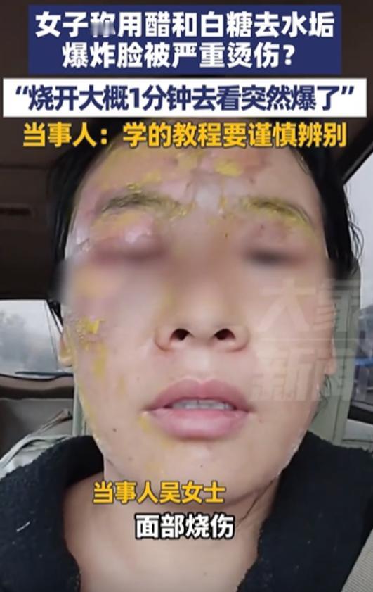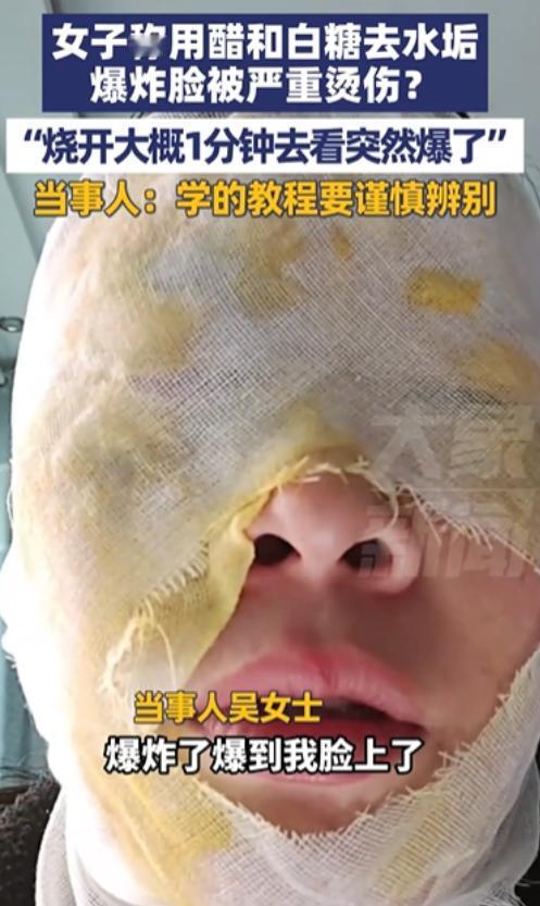 河北邯郸,女子为了去水垢,竟然直接将醋和白糖放进去烧,水开后1分钟,她揭盖想看看水垢还在不?结果,刚打开盖子,就听到“嘭”的一声巨响,突然就爆了,开水全部溅到女子脸上,导致女子的脸被严重烫伤! 据她所说,她家里的保温壶用了快两年,壶底积了一层厚厚的水垢,平时倒开水的时候,偶尔能看到小碎渣子,喝着总觉得不舒坦。 不久前,她在网上刷到一个清除水垢的“小妙招”,说只要把白醋和白糖放在一起烧开,倒进有水垢的容器里,就能轻松除垢,还标注着“亲测好用”。 她没多想,觉得这方法简单又不用花钱,就打算照着试试。她找出家里的白醋和白糖,按照网上说的比例,把两种东西都倒进了保温壶里,再加入适量水。之后她把混合液倒进锅里烧开,紧接着又迅速倒回了保温壶中,盖紧盖子等着水垢软化。 大概过了一分钟,她有点心急,想看看水垢有没有开始脱落,就凑到保温壶跟前,伸手准备揭开壶盖。 就在她刚把壶盖掀开一条缝的时候,突然听到“嘭”的一声巨响,保温壶里的沸水瞬间喷溅而出,径直泼在了她的脸上。 突如其来的冲击让她猝不及防,滚烫的开水带来的剧痛让她立刻尖叫起来。慌乱中,她想起烫伤后要赶紧用凉水冲,就急忙跑到水龙头下用清水冲洗面部,随后立刻赶往附近的诊所就诊。 好好的除垢操作,怎么会变成“爆炸现场”?化学专家对此做出了解释。 原来,水垢的主要成分是碳酸钙、氢氧化镁这些碱性物质,而白醋里的醋酸会和这些物质发生化学反应,这个过程中会产生大量的二氧化碳气体。她把烧开的混合液立刻倒进保温壶,封闭的空间让产生的气体无法及时排出,内部压力就会急剧升高。 加上高温环境让反应变得更剧烈,白糖又增加了水的黏度,让气泡更稳定不容易释放,多种因素叠加,最终导致了爆炸喷溅的意外发生。 据她后来接受采访时说,当时真是吓坏了,现在脸上的伤还在恢复中。她后悔不已,希望通过自己的经历提醒大家,网上的生活技巧五花八门,可不是都靠谱,动手试之前一定要多留心。 其实像她这样因为轻信“网红妙招”受伤的情况并不少见。在社交平台上搜“除水垢”,能出来一大堆所谓的“窍门”,但其中不少都缺乏科学依据,甚至暗藏危险。 专家明确表示,除水垢其实根本不用加白糖,白糖不仅帮不上忙,还会增加安全风险。正确的做法很简单,只用白醋就够了:可以在壶里加适量白醋和水,烧开后关掉火静置几小时,水垢自然会软化脱落;要是怕高温有风险,用温水加白醋浸泡也行,虽然慢一点但更安全。 除了除水垢的误区,生活里还有不少常见的危险品和错误操作需要警惕。比如打火机不能放车里暴晒,高温会让里面的气体膨胀爆炸;家里的酒精要放在阴凉通风处,用的时候远离明火;杀虫剂遇高温或撞击也容易炸,千万别和电蚊拍一起用。 更关键的是清洁剂混用的问题,84消毒液和洁厕灵一起用会产生有毒的氯气,让人恶心呕吐甚至窒息;洗衣液和84消毒液混合,不仅会失效,还可能生出有毒物质,这些都是必须避开的“雷区”。 专业人士建议,家里的水壶、水杯最好每隔一两月就彻底清洁一次,除了白醋法,还能用小苏打煮水、鸡蛋壳煮水这些更安全的天然方法。要是嫌麻烦,买专门的水垢清洁剂也可以,按照说明书操作,既省心又安全。 她的经历给所有人敲了个警钟:生活里的小事藏着大学问,尤其是涉及化学物品和高温操作时,千万不能掉以轻心。面对网上流传的各种“妙招”,多留个心眼,先想想有没有科学道理,实在拿不准可以问问专业人士,别让图方便的想法变成伤人的隐患。毕竟不管做什么,安全永远是第一位的。 对于这件事,你有什么看法呢?欢迎在评论区留言讨论!