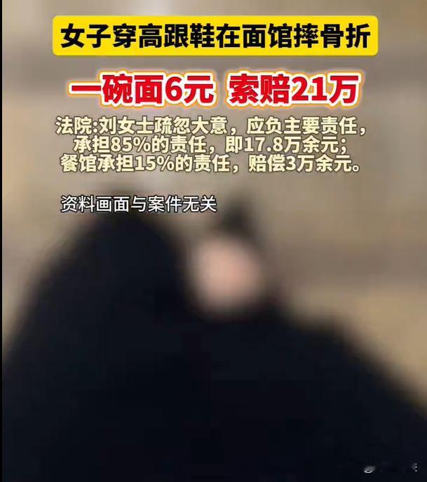 岳阳,一名女子到面馆就餐,点好面食之后,女子准备返回座位。在返回座位的途中,经过一处拐角,踩空台阶,一下子就磕倒在玻璃拉门边缘。女子当时穿着高跟鞋,没有注意到台阶,摔倒之后,面馆老板帮忙拨打120救护车,将客人送至医院。CT显示,女子髌骨骨折,需要立刻手术,出院之后,女子被鉴定为十级伤残。 法治进行时10月13日报道了这则新闻。拿到诊断报告书之后,这位女子立即找到餐馆,她认为是在餐馆里发生的意外,需要对方作出经济赔偿。 刘女士是一名上班族,平时上班公司有要求,需要穿高跟鞋,因此刘女士每天都会踩着高跟鞋出行。 这一天下班,刘女士来到一家面馆吃饭。踩着高跟鞋,“噔噔噔”走到前台处点餐。刘女士点好一份6元钱的面条,付完款之后,笃笃悠悠走向自己的座位。 就在刘女士经过一个拐角处时,拐角部位有一个台阶,刘女士穿着高跟鞋,一个不留意,双脚一滑,直接踩空、崴脚,一个踉跄摔倒在地。 台阶的旁边就是玻璃门,当时刘女士腿部也磕到了玻璃门,跌倒在地的时候,膝盖处又磕碰到台阶边缘。 眼看着客人重重摔倒在地,面馆老板也大惊失色,赶紧跑过来查看客人的情况,并且及时帮忙拨打了120急救电话,将刘女士及时送到医院治疗。 到达医院之后,根据拍摄片子的情况可知,刘女士髌骨骨折,需要立刻住院进行手术。做完手术之后,住院小结上也作出了医疗诊断:刘女士属于十级伤残。 看到报告书,刘女士脸色煞白,没有想到自己会伤的这么严重。医生也给出建议,后面需要休息180天,护理90天,营养60天。 刘女士感觉,不仅要承受身体的痛苦,而且班也没法上了,生活收入是个问题。她觉得,就是面馆的问题,斜坡设计不合理,并且面馆老板也没有在斜坡处张贴警示标志,这才导致自己疏忽大意摔残。 于是,刘女士就拿着这份伤残报告找到了面馆的老板,提出让老板赔偿自己21万元。听到这个数字,老板认为刘女士狮子大开口,当时是她自己穿高跟鞋走路不注意才摔伤,怎么能说是餐馆的责任呢。 眼见双方因为赔偿问题、协商无果,刘女士就将面馆老板给上诉了。刘女士称,自己在面馆里受伤,这已经是既定事实,当时斜坡台阶并没有警示标语,而且这个坡度本身就存在安全隐患。 面馆老板则称,客人并非第一次在店内吃饭,对于店内的布局也早就具备一定认知。另外,她穿着很高的高跟鞋,自己就该提高注意力,不能因为自己不小心引发危险,就找餐馆来要赔偿。 最后,根据审理之后认为,刘女士自身疏忽大意,需要承担主要责任。而作为经营餐馆,也需要及时消除障碍与危险,避免客人在店内受伤,因此,面馆也需要承担部分责任。 最后,餐馆被判需要赔偿刘女士3万元,后期要改善经营环境,保证对就餐者的安全尽到保障义务。 1.女子在店内就餐,不小心踩空台阶导致骨折,餐厅需要作出赔偿吗? 根据《民法典》相关规定,餐厅作为经营场所负有安全保障义务,如果未尽到合理义务,如台阶设计不合理、或者没有警示标志,导致顾客受伤,餐馆需要承担部分责任。 餐厅作为经营场所,需要及时消除店内安全隐患,如果存在缺损、无警示标志等,就需要及时整改,确保就餐环境安全,保证客人的合法权益。 而作为客户自己,明知道高跟鞋分平衡感存在危险,还是疏忽意识导致踩空,客户需要对自己的疏忽大意负责。 2.就餐时,由于女子穿着高跟鞋,因为自己疏忽大意导致摔倒,餐厅是否需要承担一定责任呢? 根据《民法典》第1198条规定,餐厅需确保地面防滑措施到位,及时清理湿滑区域。如果店内设施存在安全隐患,则需要采取措施保障客户安全。 即使餐馆已经整改到位,还是导致客户受伤,餐馆仍然需要承担部分责任,比例为15%左右。较好的做法就是,尽快消除隐患,遇到粗心大意的客户要及时提醒,建议其缓步行走、注意脚下,防止遭受意外。 作为经营场地,肯定要保障安全。另外,身体是自己的,不能将自己的人身安全交付给他人,这才是关键。对于本案,大家都作何看法呢。
