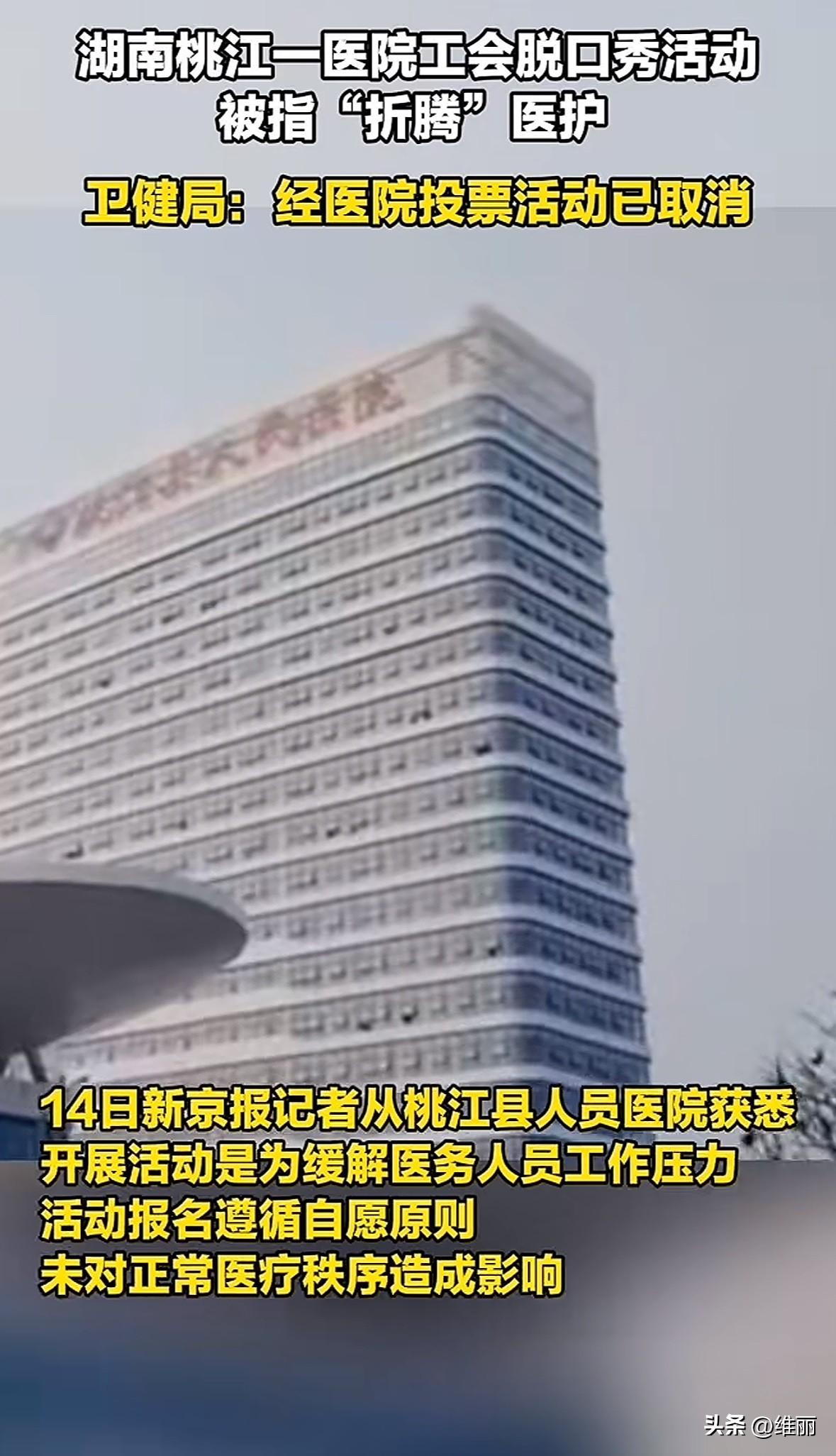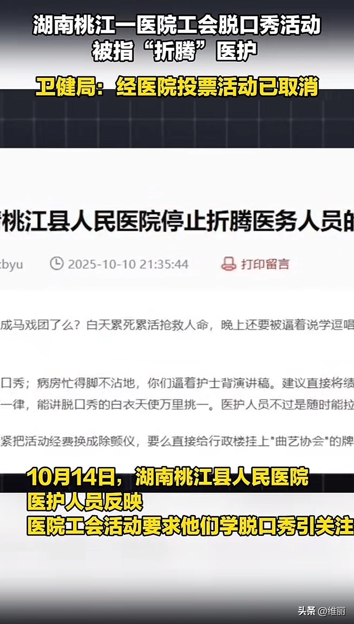 湖南桃江县人民医院工会组织演讲比赛、脱口秀等活动,要求临床一线医护在休息日或下班后参加,被员工投诉强制占用休息时间,影响生活和健康。 院方回应称活动自愿,是为丰富生活、缓解压力,没影响医疗秩序。 10月14日,医院经投票取消了活动,还说以后会减少这类活动,尽量避开医护休息时间。 这事看着是小事,其实暴露了管理问题。临床医护本就忙得连轴转,休息时间特别宝贵,强行安排活动根本不是减压,反而像负担。 工会搞活动初衷是好的,但得站在职工角度来。不尊重一线人员的时间,再好的活动也没人买账。真要凝聚人心,先保障好大家的休息权才是关键。