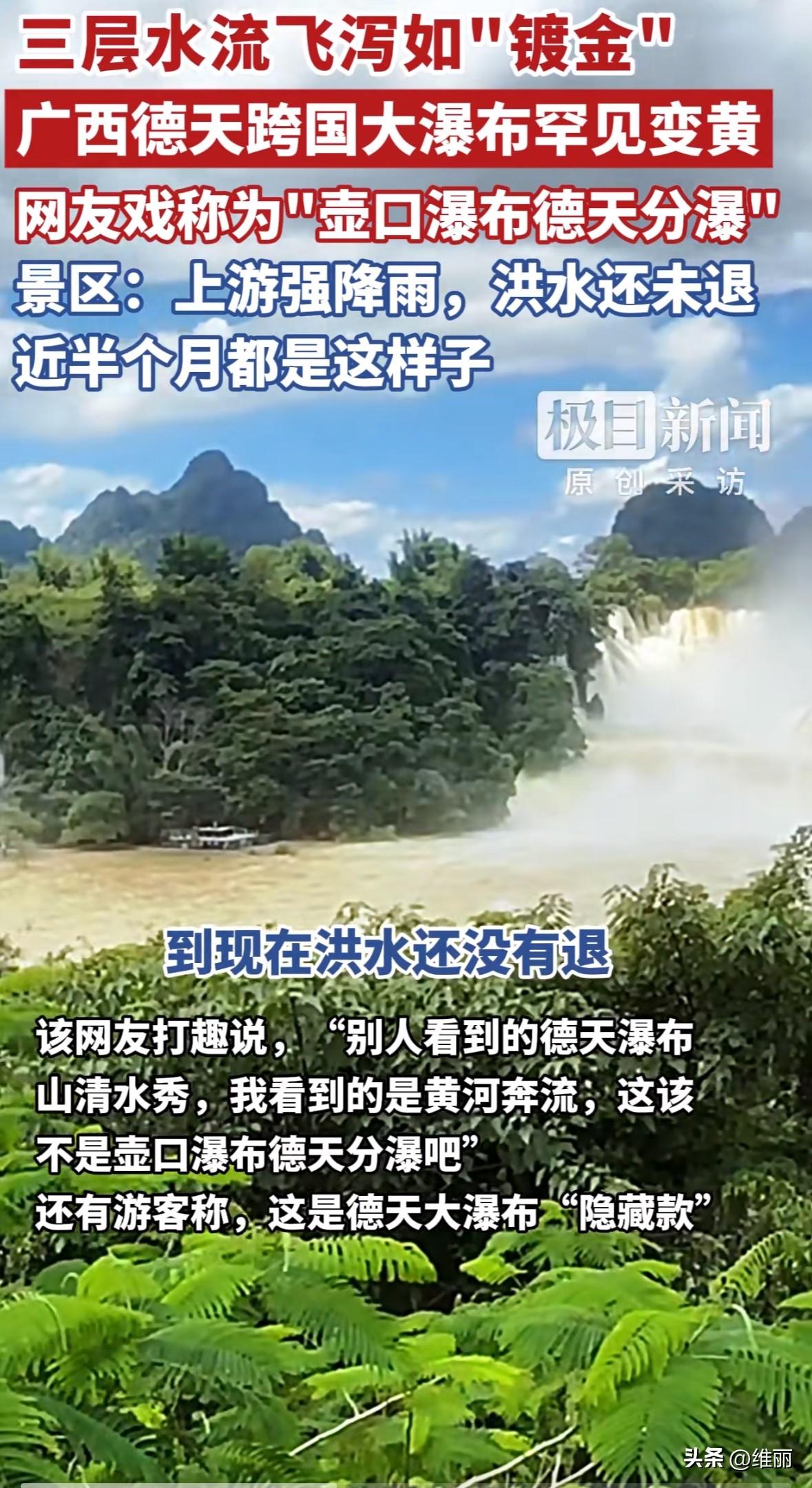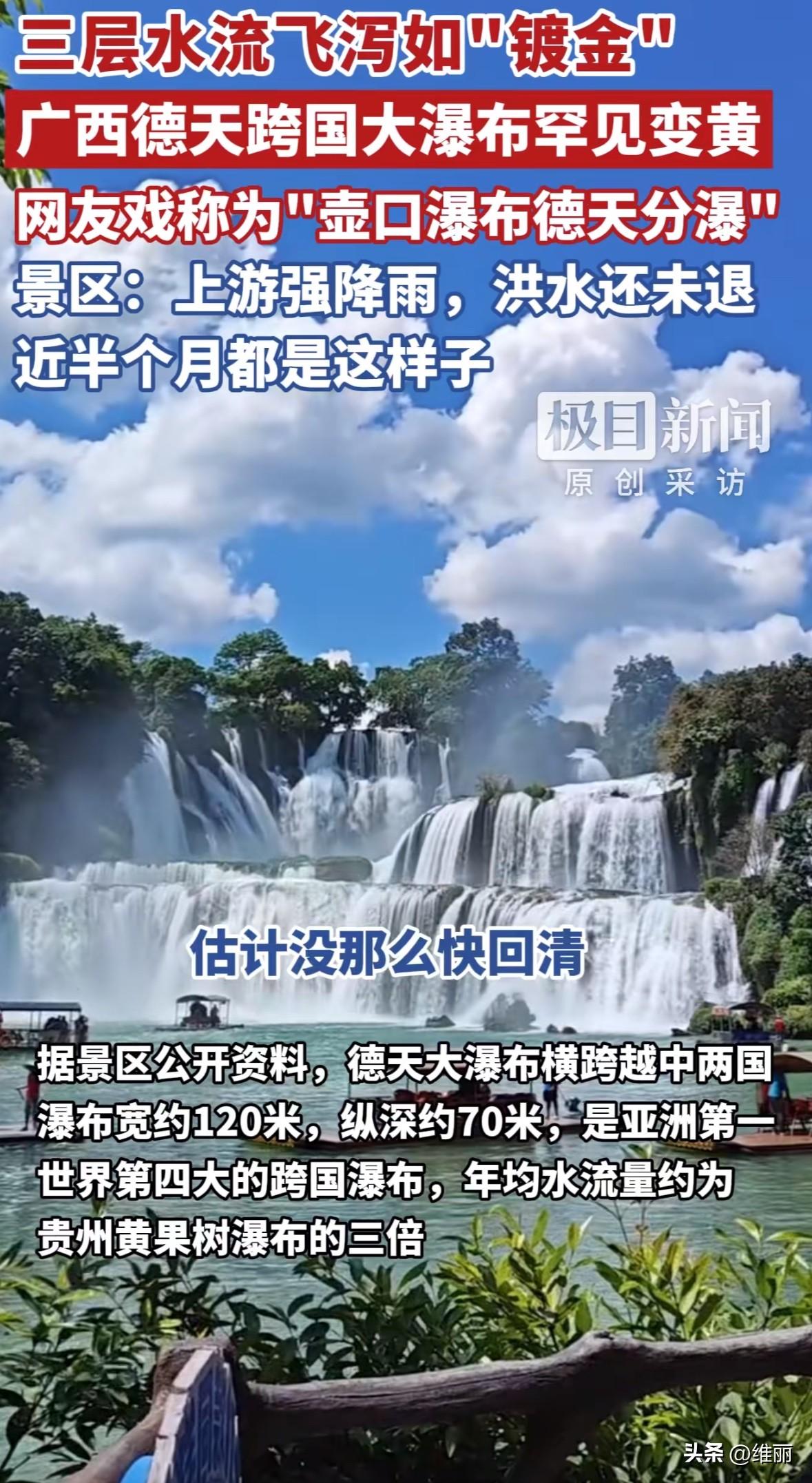 广西德天跨国大瀑布最近半个月都变黄了,三层水流急坠而下,像金色的瀑布在飞泻,特别壮观。 景区工作人员说,这是月初台风“博罗依”影响,中越两边都下了大雨,加上最近还在下雨,瀑布在河水下游,水流带着泥沙就变黄了。 网友都觉得新奇,有人说像“壶口瀑布德天分瀑”,还有人戏称是广西的“砂糖橘瀑布”。 这其实是丰水期的正常现象,德天瀑布四季景色不同,丰水期水量大就容易出现这种“黄金瀑布”奇观。 现在景区正常开放,但水位太高,竹筏项目暂时停了。这种自然造就的“限定景观”还挺难得,就是去玩得注意安全。