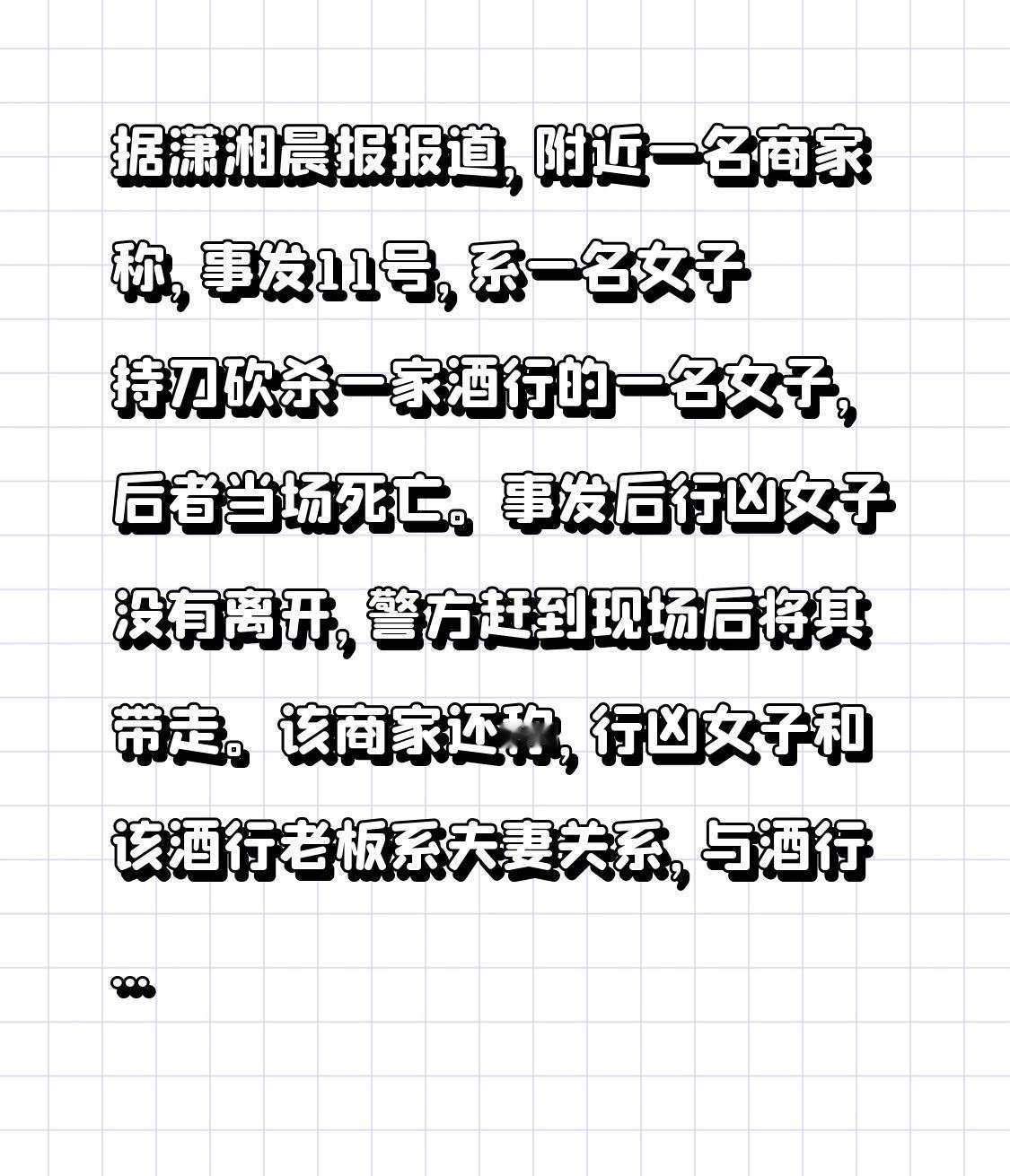 据潇湘晨报报道,附近一名商家称,事发11号,系一名女子持刀砍杀一家酒行的一名女子,后者当场死亡。事发后行凶女子没有离开,警方赶到现场后将其带走。该商家还称,行凶女子和该酒行老板系夫妻关系,与酒行老板在网上相识,并非本地人,酒行是去年开的。两人婚后关系出现问题,且疑似存在经济纠葛,行凶女子此前也来找过两次酒行老板。在事发前的一段日子,该行凶女子曾来其店里买过东西,说要直播曝光那家酒行,但在此次事件中,该行凶女子与酒行老板及其姐姐发生肢体冲突,致该行凶女子住院。“印象里她(行凶女子)比较有礼貌,但也有人说感觉她精神不太正常。发生这样的事情是很惋惜的。”该商家称,遇害女子应该是酒行老板的小辈,不清楚当日为何遇害,“她(行凶女子)应该是来找她老公,但她老公一直躲着不见她” 。另一名商家事发时已经下班,不太清楚详情。有附近居民称,事发后,该酒行被贴了封条。持刀事件 伤人案 行凶杀人 湖南行凶案 湖南伤人案 医院砍人事件 成都刺死女