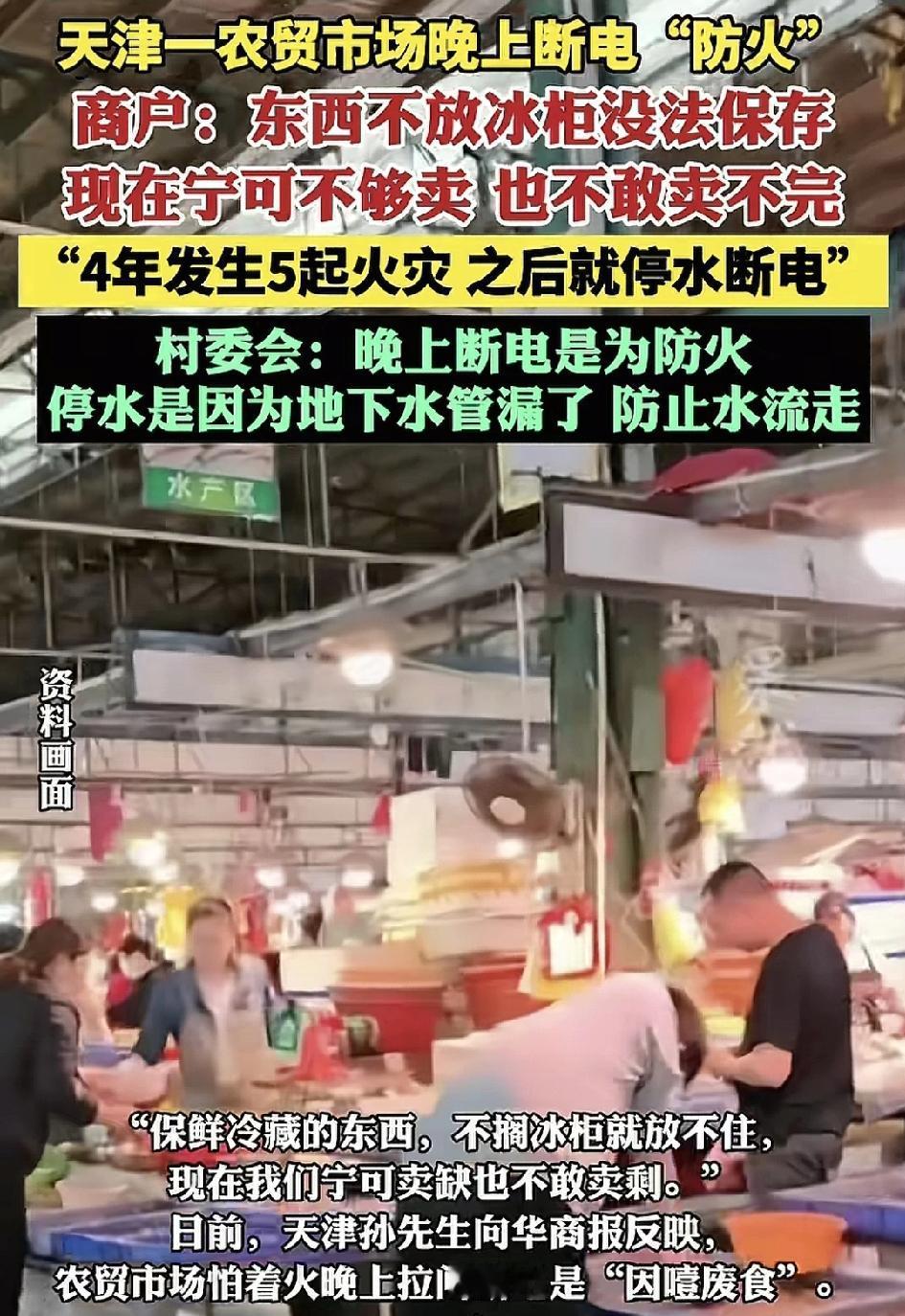 天津一农贸市场因为防火完上整个市场断电,不少商户宁愿平时的货不够卖,也不敢存货过多,因为没冰箱根本就不能放菜和肉。商户称4年来市场发生了五起火灾,有一次是大年三十晚上7点着火,整一个2区都被烧剩下空架。不少网友戏称这是“因噎废食”。因为怕出问题而干脆不干了,管理层是否要考虑把市场的电路重新更换,或者是24小时有人值班?毕竟菜市场每个店铺没有电真的很不方便。
