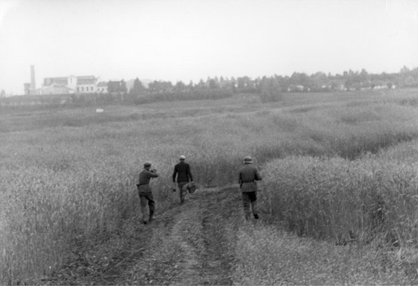 德国武装党卫军宪兵枪杀一位被指为游击队员的苏联平民,摄于1941年11月7日。 被害人头戴鸭舌帽,右手提着马克沁机枪的弹箱,据说左手拿着DP轻机枪的弹盘。他可能是因为被发现私藏了武器弹药而被认定是游击队员的。德国人逼令他拿着弹药箱作为证物,把他带到野外杀害了。 第一和第三张照片常在介绍埃尔玛EMP.35冲锋枪的文字中被引用。