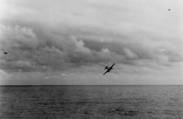 两架美国海军F4U海盗舰载战斗机追击日本海军P1Y1银河式轰炸机,1945年4月7日在冲绳附近的美军舰艇上拍摄,照片上还可看到舰艇发射的20毫米厄利空高射炮曳光弹迹。 4月6日和7日两天日本海军出动了近700架飞机发动菊水一号作战,不过更广为人知的是从水上发起特攻的大和号在4月7日被美军飞机炸沉了。