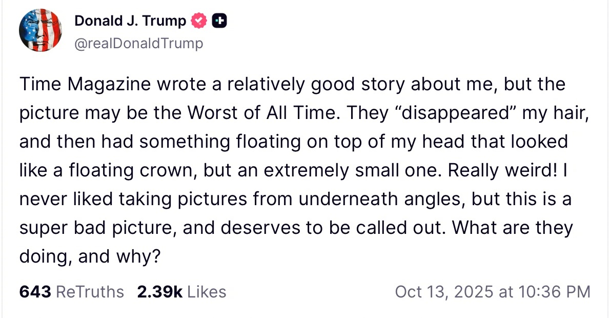 【特朗普怒批时代周刊给他选的封面:史上最差】美国东部时间10月14日凌晨,美国总统特朗普在其创立的社交媒体“真实社交”上发帖,抱怨美国《时代》周刊选了一张他“史上最差的照片”当封面图。