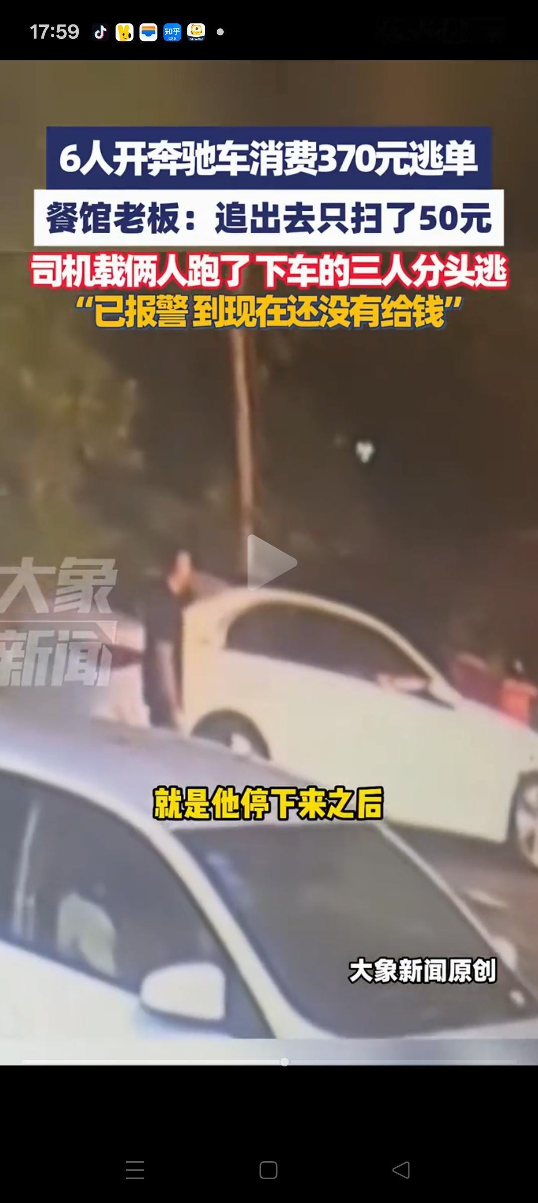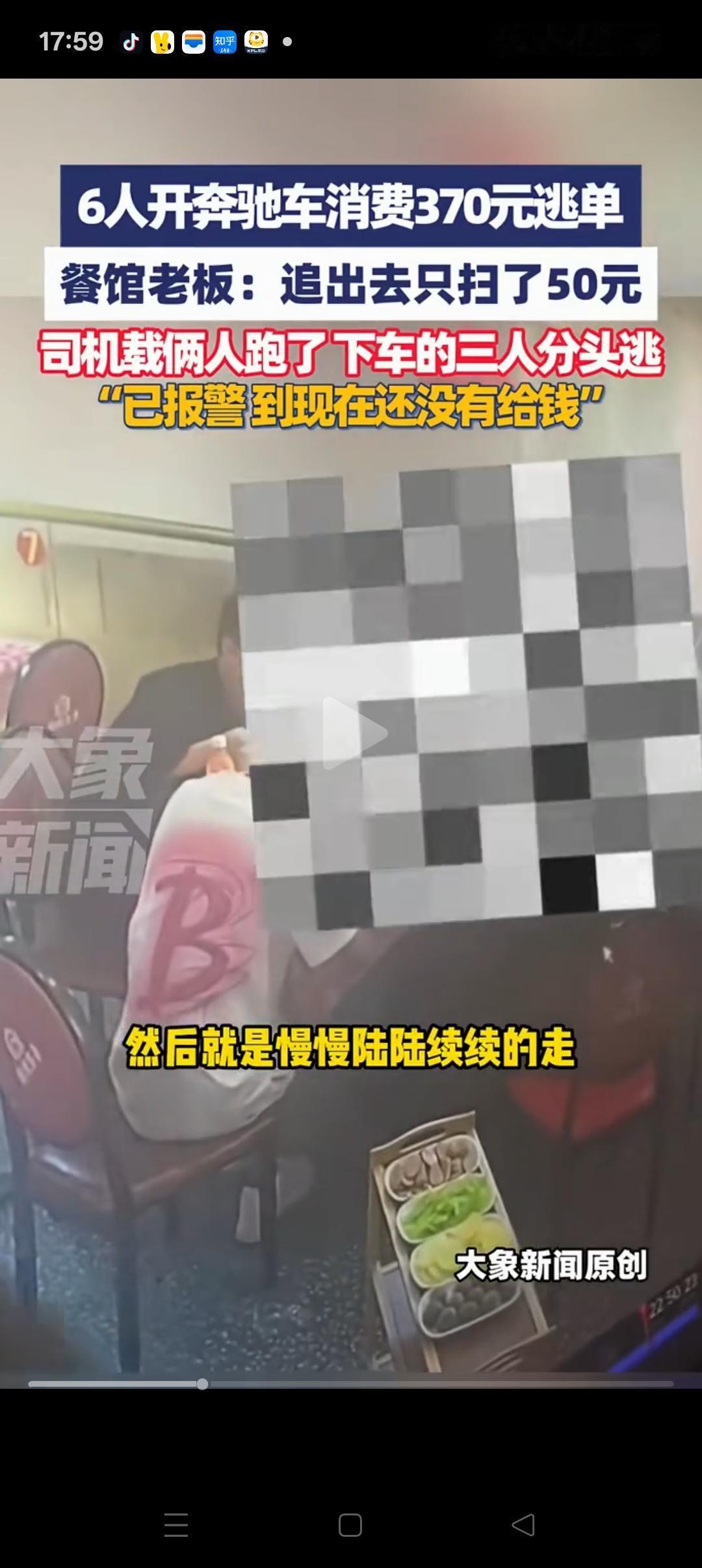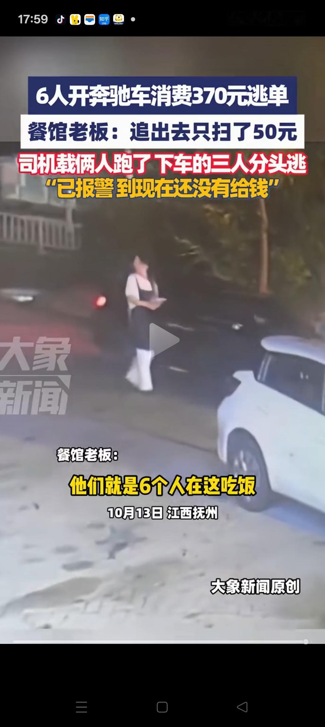 “这是有多蠢呐”,江西抚州,6个人开奔驰车在餐厅消费了370元后逃单。老板说:他们是分开走的,第二波人走的时候自己追上去了,他们凑了半天,就拿出了50块钱,然后就分散跑路了,根本追不上。 这几个人多少有点蠢,现在哪个餐馆没有摄像头的,况且你们还是开车来的,车牌号被拍的一清二楚,还怕找不到你们吗? 奔驰车加一次油也要几百块钱吧,我就不相信6个人凑不出370块钱。 不过也有一种可能,奔驰车是借来撑场面的,这顿饭从一开始就没想给钱,纯纯街溜子[捂脸][捂脸]