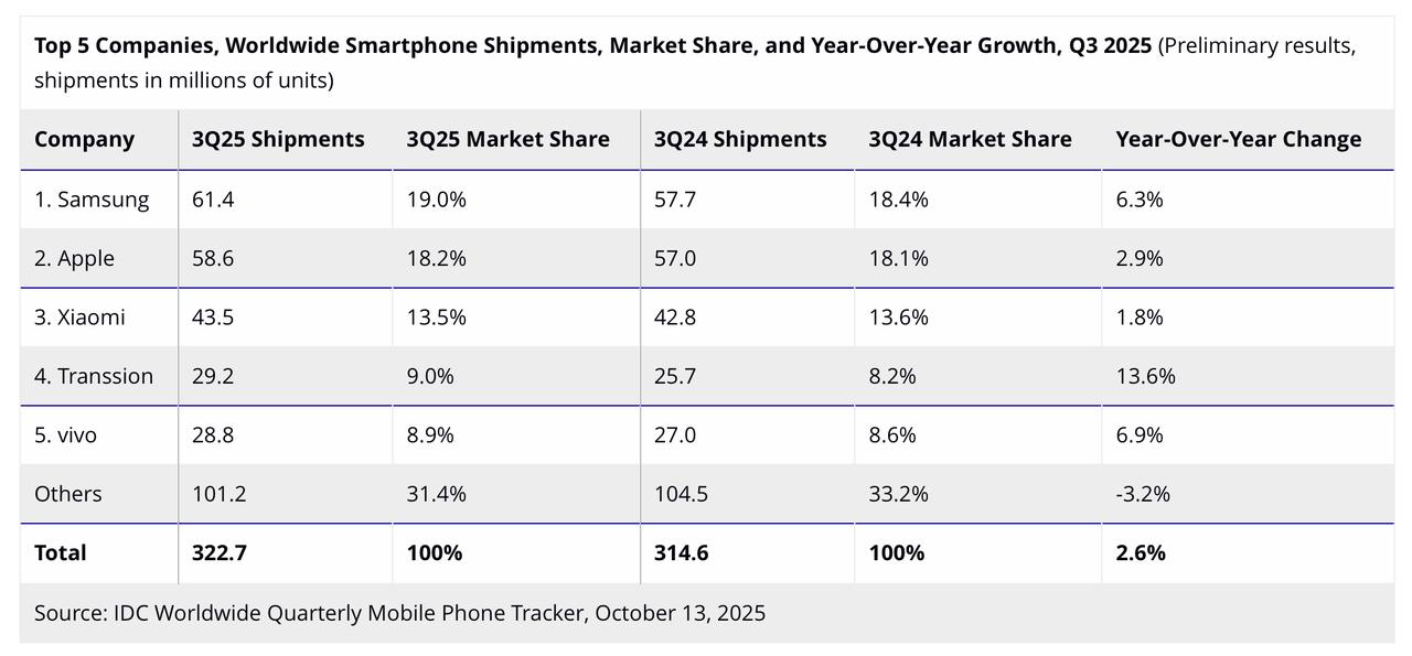 2025年7-9月全球智能手机出货量top5 三星,6140万,+6.3% 苹果,5860万,+2.9% 小米,4350万,1.8% 传音,2920万,13.6% vivo,2880万,+6.9% 其他累计,1.012亿,-3.2%