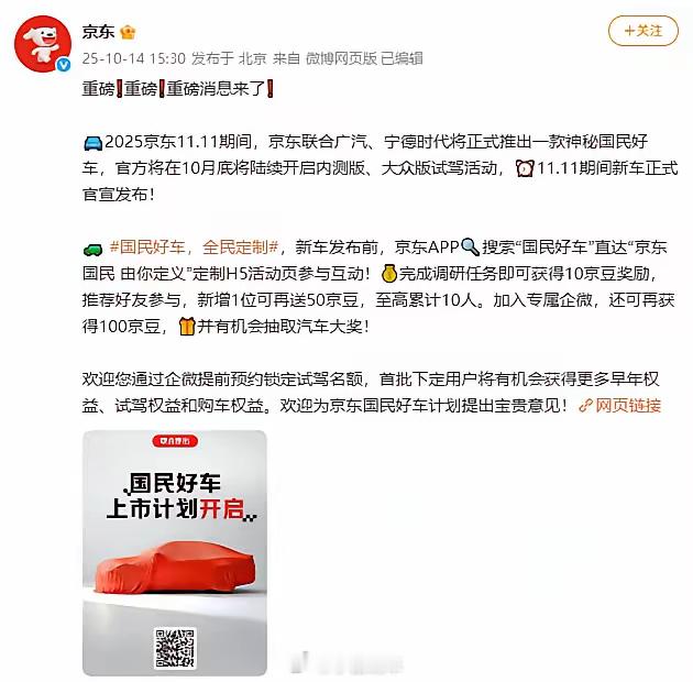 10月14日,京东微博宣布联合广汽、宁德时代将推出一款汽车,官方将在10月底陆续开启内测版、大众版试驾活动,11月11日期间新车正式官宣发布。大v聊车