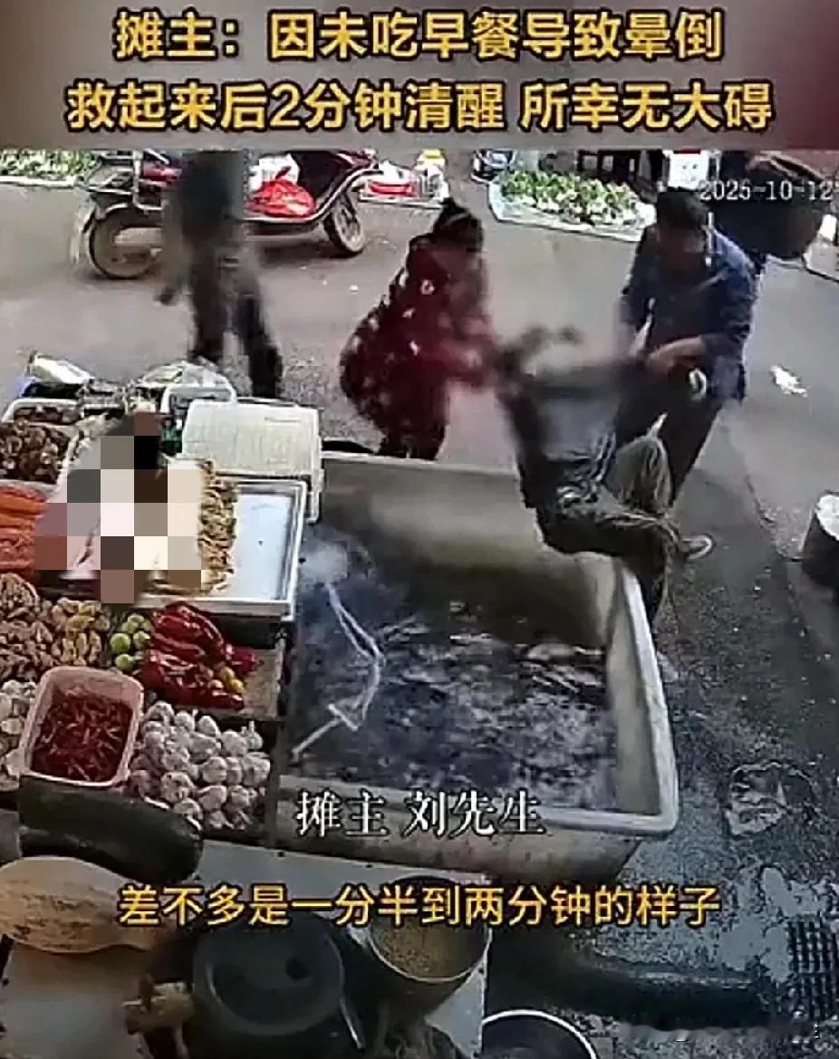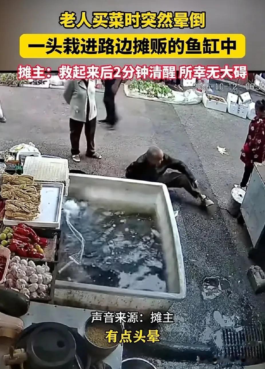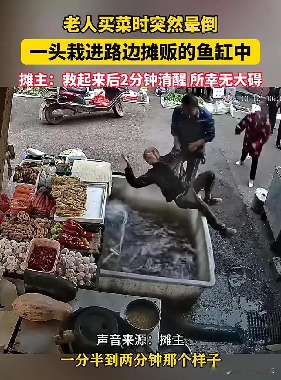 太危险了!湖南老人买菜晕倒栽进鱼缸,多亏老板果断施救,两分钟就清醒了。网友:鱼缸竟成“救命池”。 年龄大了,尽量不要一个人外出,以免没有人发现,导致悲剧。 10月12日,湖南张家界,一家路边鱼摊前,走来位白发苍苍的买鱼老人。 可能想挑条鱼回家,他站在鱼缸前看了很久,突然“扑通”一声,头朝下直接掉进了鱼缸里。 一开始,老板以为是鱼跳出了缸,扭头一看吓一跳,赶紧跑过去将老人扶起来。 这时,另外一家摊位前的大妈也一路小跑着过来,一起帮忙扶出了老人。 等待两三分钟后,老人才缓过来神,老板和大妈这才放开手,长长地松了一口气。 细问之下,老人才娓娓道来,原来他有低血糖,加上早上又没有吃早餐,才发生了刚才危险的一幕。 老人掉进鱼缸里,被老板好心扶起,引发网友们热议。 有人忍不住调侃,鱼估计都懵了,本来鱼缸里就挤,突然又来个人,意见可大了。 还有网友替老板捏把汗,真是人在摊中坐,祸从街上来啊!幸亏老人没事,不然保不准要被讹钱。不过也多亏了鱼缸里的凉水,把老人浇清醒了,要是栽在马路上,后果不堪设想! 也有网友直言,幸好老人醒了,不然老板怕是要被索要天价赔偿。说实话,身体不好就别独自出门了,出事了又要找别人负责。 写在最后 老人能化险为夷,鱼摊老板和热心大妈功不可没,必须给这位毫不犹豫救人的老板怒赞! 更万幸的是,摊上安装过监控,不然老人晕倒这事,老板怕是跳进黄河也洗不清了。 通过这事,也给大家提了个醒,家里有老人的,尤其是身体不太好的,尽量别让他们独自出门。 万一像这位老人一样,突然出事后,身边又没人及时帮忙,很容易酿成悲剧。 希望大家都能多留意家里老人的身体状况,确保他们平平安安地安享晚年。 欢迎讨论,如果遇到这种事,你会去扶吗? 消息来源于《荔枝新闻》