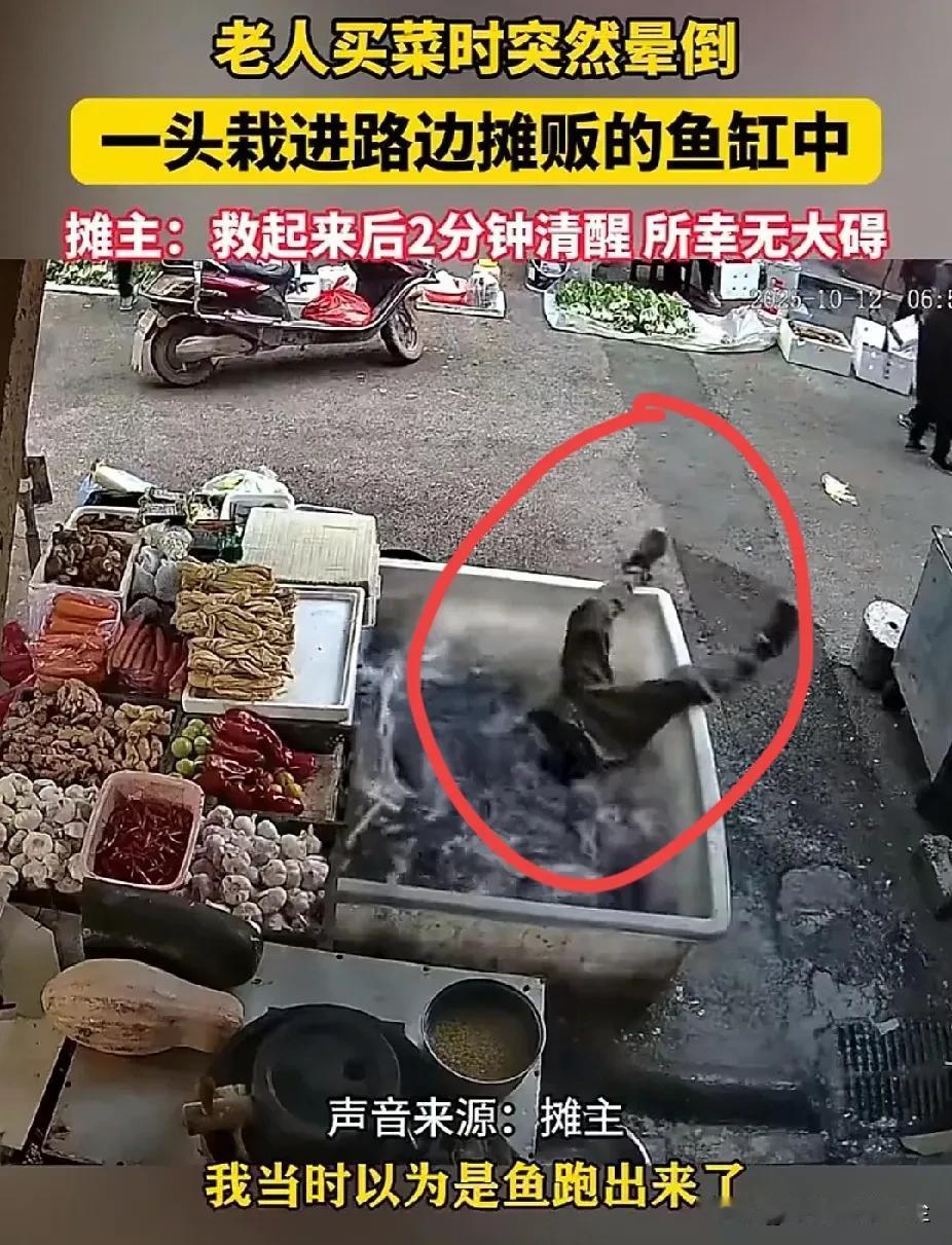 太危险了!湖南老人买菜晕倒栽进鱼缸,多亏老板果断施救,两分钟就清醒了。网友:鱼缸