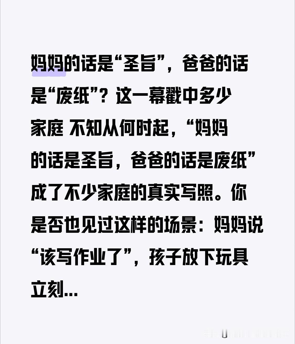 妈妈的话是“圣旨”,爸爸的话是“废纸”?这一幕戳中多少家庭 不知从何时起,“妈妈的话是圣旨,爸爸的话是废纸”成了不少家庭的真实写照。你是否也见过这样的场景:妈妈说“该写作业了”,孩子放下玩具立刻坐回书桌;可爸爸重复三遍同样的话,孩子却头也不抬,依旧沉浸在自己的世界里。妈妈一句“睡前要刷牙”,孩子乖乖走进卫生间;爸爸催着“快洗脸睡觉”,孩子却能找无数个理由拖延——这样的对比,让不少爸爸无奈又心酸,也引发了无数家长的共鸣。 其实,孩子的“区别对待”并非刻意“偏心”,背后藏着他们对亲子关系的直观感知。妈妈往往在日常照料中投入更多时间:清晨准备早餐时的叮嘱,睡前讲故事时的陪伴,生病时无微不至的照顾……这些高频的互动,让妈妈的话语与“安全感”“依赖感”紧密相连。而爸爸们或许因工作忙碌,参与孩子成长的碎片时间较少,缺少了这些细腻的情感联结,话语的“分量”自然在孩子心中打了折扣。 但这并非无法改变的“定律”。爸爸的爱从不是“废纸”,只是需要找到合适的“投递方式”:可以是每天固定十分钟的亲子阅读,是周末一起去公园的奔跑,是孩子遇到难题时耐心的引导。当爸爸的身影更多出现在孩子的日常里,当话语里藏着陪伴与理解,孩子自然会感受到这份深沉的爱。毕竟,对孩子来说,最幸福的成长,从来不是“圣旨”与“废纸”的对比,而是爸爸妈妈的声音,都能成为他们心中最温暖的指引。 为什么孩子只听妈妈的话?这份“区别对待爸爸的话语 妈妈经典说的话 对妈妈的话 妈妈金句 儿子放学说