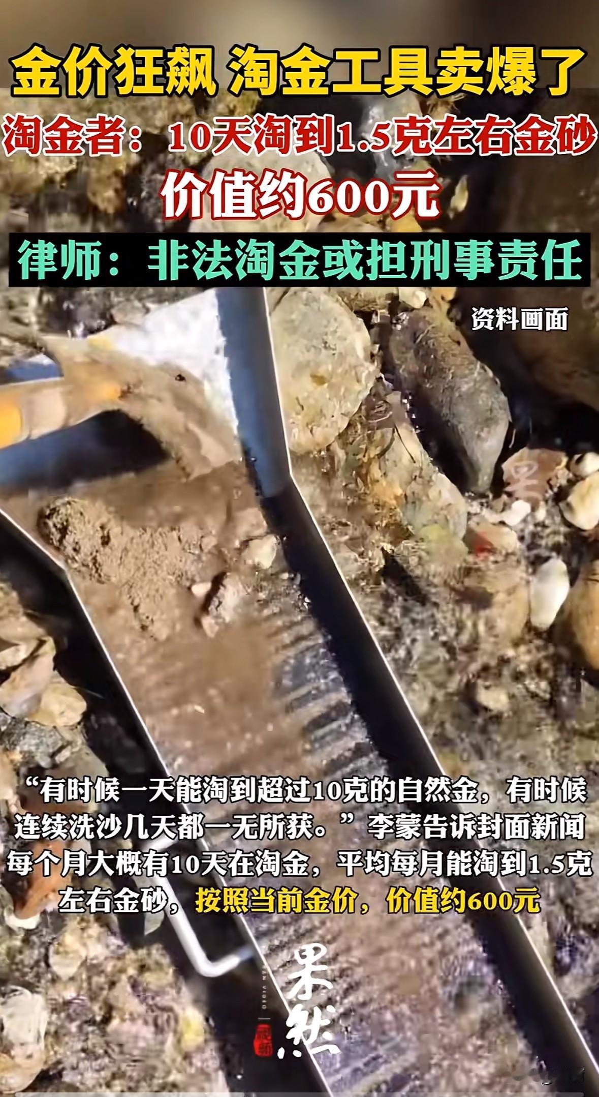 国际金价持续上涨,国内足金饰品克价已到1213元,美国金价也创纪录。江西山涧有了淘金者,网上淘金盘月销上千件,有店铺销量同比涨三倍多。美国民众抢着买镐、淘金盘,5加仑桶需求增50%,淘金课早被抢空。 这波热潮源于美联储降息预期、避险需求释放等因素,大家都想靠黄金避险或赚钱。但别盲目跟风,网上有假淘金视频骗学费,用铜锌铝锡造假黄金博眼球。而且没证淘金涉嫌非法采矿罪,可能判三年以上,还会破坏环境。 真要试,小规模玩得合规,挖到值钱的得上交,大规模必须办证。大概率淘不到多少,别被暴富梦冲昏头。