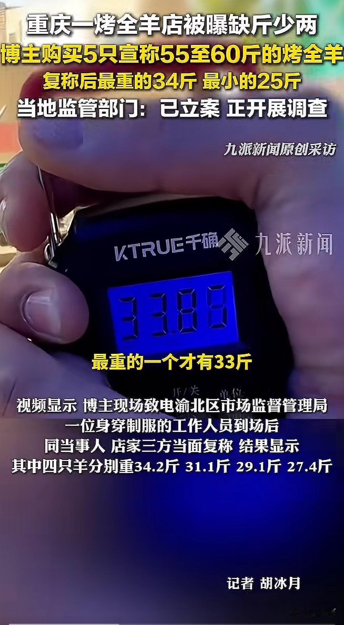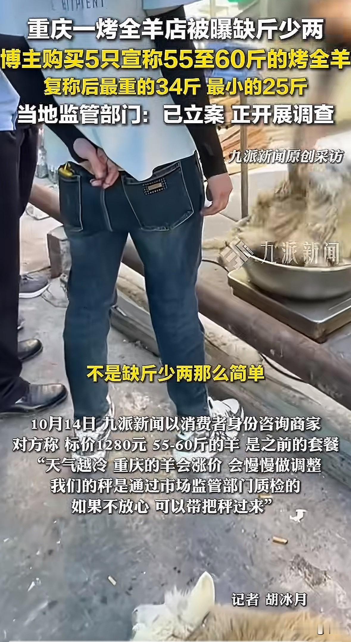 重庆两家烤全羊店被探店博主曝光缺斤少两。渝北区某店宣称羊重55-60斤,博主自带秤称出最重34斤、最小25斤左右,监管部门到场复称核实,已立案调查。巴南区某店1598元套餐宣传60斤以上,实际仅34斤,帮其他顾客复称45斤的羊也只有22斤,店家不认错还报警。 这种缺斤少两就是欺诈,月销近2000单的店这么做,坑了不少消费者。好在法律有规定,缺斤少两可要求退一赔三,不足五百按五百算,还能打12315举报。 监管立案调查是好事,得好好查到底。消费者在外吃饭也要多留心,保留好称重记录、付款凭证,遇套路别忍气吞声,该维权就维权。