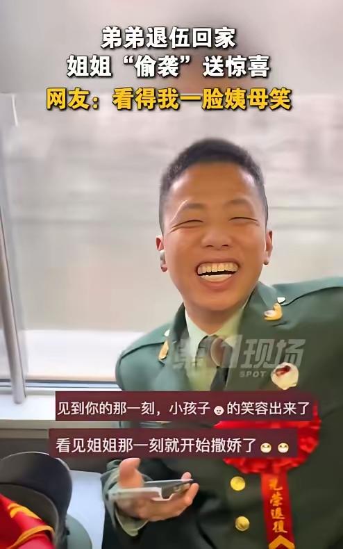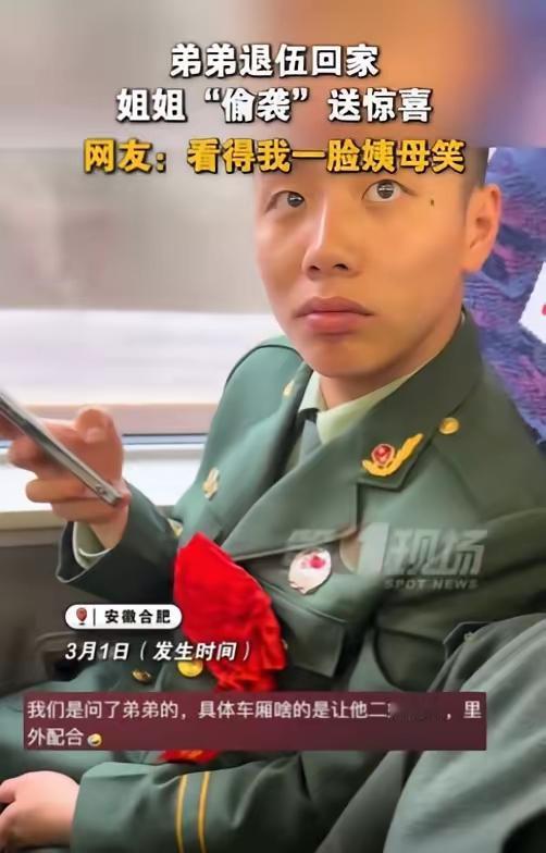 看哭了!3月1日安徽合肥,一小伙退伍乘坐高铁回家,正在玩手机时,突然遇到一位美女搭讪,小伙抬头一看瞬间傻眼了,害羞的喊了声“姐”!随后就笑得合不拢嘴了! 这哪是美女搭讪啊,是姐姐偷偷准备的“爱的偷袭”!为了给刚退伍的弟弟惊喜,她特意查车次、算时间,中途上车站到弟弟面前,这份用心比啥礼物都暖。 你看小林那反应,从傻眼到笑开花,瞬间从严肃的退伍军人变回黏姐姐的大男孩。其实退伍兵回家哪只是归乡,更是从紧绷的军营生活,慢慢适应家的柔软,姐姐早早就懂这份不易,用惊喜先给了他一份“缓冲的温暖”。 现在好多人忙得连家人生日都记不清,可这位姐姐却把弟弟的归程放在心上,这种藏在细节里的亲情,才最打动人。你有没有为家人偷偷准备过惊喜?当时他们啥反应?