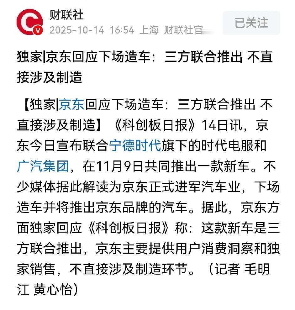 大家都误会京东了。 根据财联社10月14日最新独家报道,京东官宣造车,并不是像