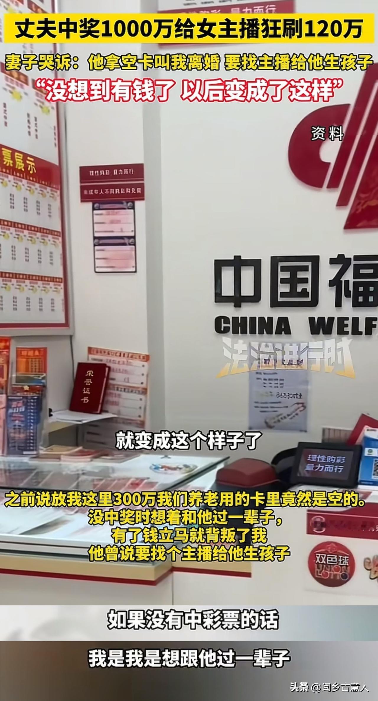 这届网友关注点真奇特,男子中1000多万彩票给女主播刷120万,网友却怀疑中奖真实性而不是事件本身 事情是这样的:德州一女子找小莉帮忙,她原本以为和丈夫是属于一生一世一双人,结果在丈夫中彩票1000万后(税后810多万),两个人的婚姻就走到尽头了。 丈夫在中奖后曾承诺会存300万留着两夫妻养老、旅游用,结果却在中奖第三天就私自取走710万。 在中奖后丈夫累积给女主播刷了120万礼物,还在高铁站看到丈夫与女主播一起旅游回家(女主播否认看到的那个女的是她)。 现在丈夫拿着没钱的空卡想与她离婚,所以她希望能在小丽帮忙下,索要回原本属于自己的那份。 事件在网上发酵后,在评论区却看到一些网友,他们关注的不是男子做法是不是有违道德或者是违法,反而在解侃中奖的真实性,认为是软文。 这些网友也挺酸的,中大奖本就是可遇不可求,中国那么大那么多人,身边没有中奖的,不代表有人中奖的就是假的。 回到事件本身,其实对于妻子来说,她没有必要伤心,中奖金额是婚内财产,丈夫不可能独吞,丈夫现在转移财产,并且出轨,妻子可以起诉离婚。 哪怕追回两三百万,也是赚到了,毕竟这中奖的钱本就是意外之喜。 拿着离婚后分到的财产,离开一个有钱就变心的男人,并不亏!