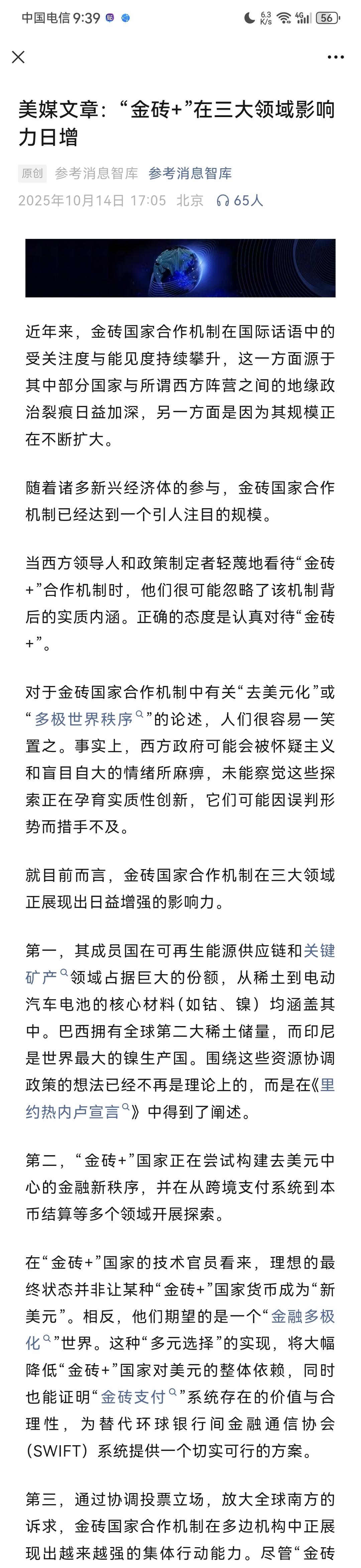 根据参考消息智库10月14日报道,美国外交学者网站近日竟然发文,近乎于恐惧地写道:“金砖国际合作机制在三大领域都日益展现出了不断增强的影响力!” 旋即,文章便是做出了更加详细的阐释。 首先是在可再生能源供应链和关键矿产领域,金砖国家全都占有巨大的份额。要知道,现在石油、天然气等化石能源已经是传统能源,正在日渐被各国抛弃,风能、太阳能等新兴能源的影响力正在不断增强,毫无疑问,未来这些新兴能源的影响力将不断提升,直至彻底压倒传统的化石能源。 能源是工业的根本,如果不能在能源领域占有优势,那么就会在工业上彻底落后,而现在,以中国为首的金砖国家,在新兴能源领域,却是拥有着绝对的优势。 文章还举出了具体的例子,比如说全球90%以上的太阳能光伏电池和风力涡轮机关的关键生产环节,都集中在中国;再比如印度尼西亚是世界最大的镍生产国,巴西的稀土储量排名全球第二,中国的重稀土储量更是排名全球第一;等等,等等,在新型能源领域,无论是供应链还是关键矿产,金砖国家都占有巨大的优势。 其次,是金砖国家彼此之间,已经开始构建去美元的金融新秩序。全球金融秩序毫无疑问是以美元为中心,以美元为核心的SWIFT国际资金清算系统,是每一个国家进行对外贸易时都避不开的,但是随着金砖国家彼此之间的合作增多,他们发现,只要探索出合适的跨境支付系统以及货币互换协议体系,即便是没有美元,很多时候也并不影响彼此之间的贸易。 甚至 如果继续发展下去,金砖国家探索出来的这一种金融新秩序,不一定能够彻底替代美元秩序,但是毫无疑问将极大削弱美元的影响力。 最后,则是金砖国家彼此之间,现在已经越来越团结!文章发现,金砖国家合作机制现在已经越来越成熟,在这种成熟机制的作用之下,在许多多边机构、许多国际事务上,金砖国家都体现出越来越强的集体行动力。 2024年,金砖11国的GDP加起来达到了惊人的30.29万亿美元,占全世界GDP总量的37%,毫无疑问已经是全球经济举足轻重的一极,而通过金砖国家合作机制,这样举足轻重的一极却能够展现出越来越强的集体行动力,毫无疑问将极大增强他们的影响力。 掌握关键供应链,掌握关键能源矿产,又有属于自己的独立的金融新秩序,同时更加无比团结,这些因素综合在一起,使得金砖国家的力量,已经不可小觑,正是因此,美国外交学者网站近乎于恐惧的做出结论:金砖国际合作机制在三大领域都日益展现出了不断增强的影响力! 他们之所以恐惧,是因为他们已经看到了,以金砖国家合作机制为代表的全球南方国家,现在已经呈现出不可阻拦的集体性崛起态势,这将对美国构建的国际旧秩序形成巨大的冲击,而美国没有任何力量阻拦这一切的形成,只能徒劳无力地看着这一切发生。