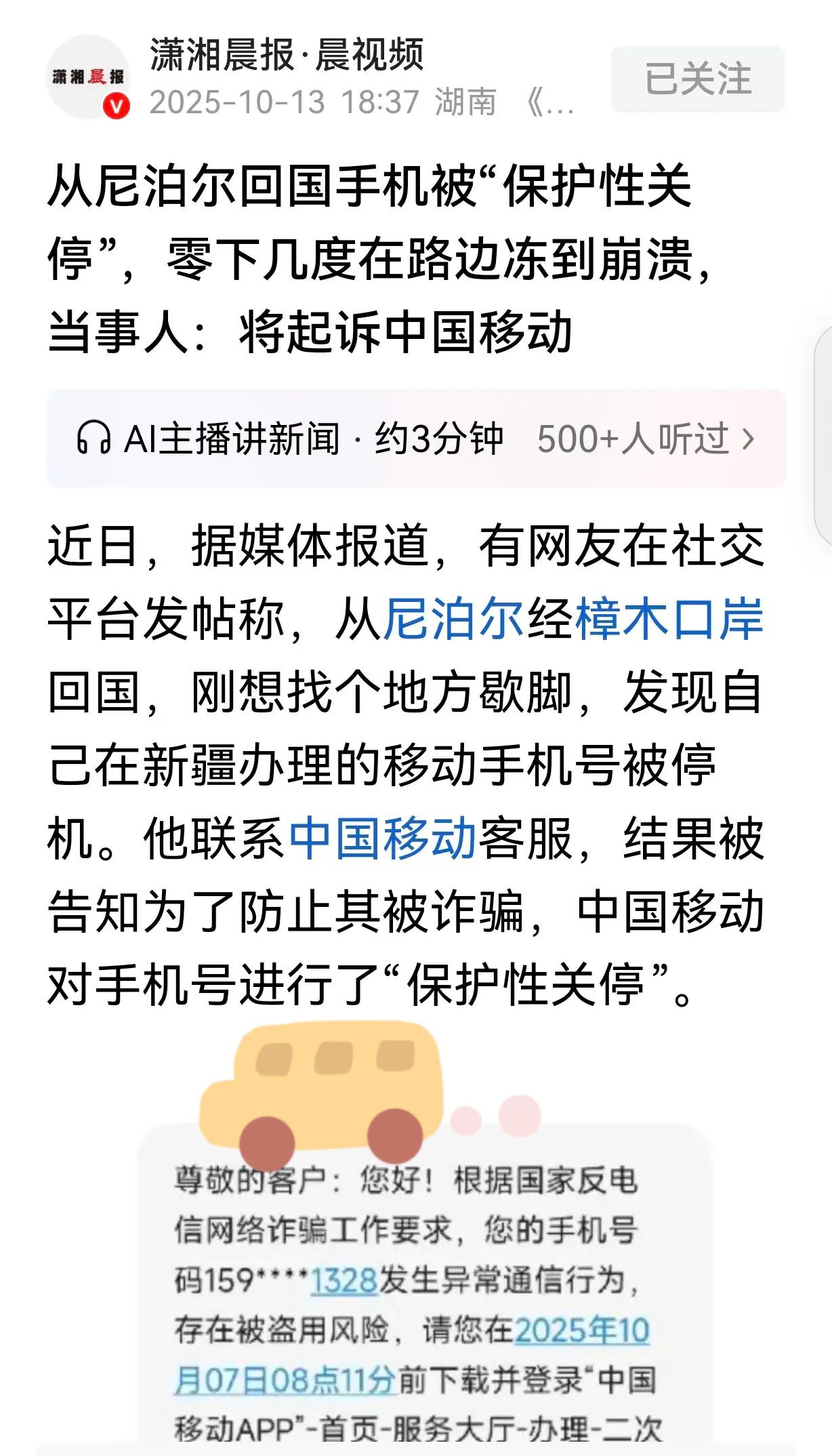 西藏,一38岁男子从尼泊尔回国,在樟木口岸时,他手机被停机,他以为欠费了,就充了200元话费,还是没开机,他联系移动客服,客服却说:为了防止你被诈骗,移动对你手机号保护性关停,想要开机必须去移动厅办理。男子在当地找了个营业厅,营业厅却说:这是新疆的手机卡,你只能去新疆办理。男子在零下几度在路边冻到崩溃,他愤怒不已,决定起诉移动公司。 各位义父,点个关注,欢迎评论,爱你们哦 这位男子叫李先生,河南人,今年38岁,平时最爱徒步旅行,国内山水跑了大半,2025年10月初,他从广州飞曼谷,再转机去尼泊尔完成了一场徒步之旅。10月5日左右,他从樟木口岸回国,刚出海关掏手机想联系住宿,就发现屏幕一直没信号——手机停机了。 当时樟木口岸下着小雪,风刮在脸上像刀子,李先生穿的冲锋衣根本扛不住零下5℃的低温。他第一反应是欠费,赶紧用仅剩的一点流量(停机前没关数据)充了200元,可等了10多分钟,手机还是没反应。他冻得搓着手躲在口岸的避风处,反复打移动客服,接通后客服的话让他更懵:“你的号码因防诈骗需要被保护性关停,必须去营业厅解封。” “我刚从国外回来,没接到任何诈骗电话,怎么就被关停了?”李先生急得声音都抖了,他跟客服说自己身上只有800多块尼币,国内现金一分没有,手机停机连打车、住店都没法弄,能不能先临时开下网让他找个住处。客服犹豫了一会儿,说可以开4小时网络,可挂了电话刚5分钟,网络又断了——他连口岸附近的酒店列表都没刷出来。 第二次打客服,接线员直接拒绝,说“没权限临时开网”。李先生站在雪地里,看着来往的车辆,冻得嘴唇发紫,眼泪都快下来了。后来还是口岸的警务人员看到他不对劲,主动上前询问,才把他带到附近的警务站休息,还帮他联系了一家可以先记账的小旅馆。 第二天一早,李先生赶紧找当地的移动营业厅,可工作人员查了他的卡号后说:“这是新疆办的卡,异地没法解封,你得回新疆的营业厅办。”这话像一盆冷水浇下来——他从西藏回新疆至少要两天路程,而且身上没钱,怎么回去?没办法,他只能在营业厅办了一张电信的临时卡,先把眼前的困境解决了。 直到10月13日,李先生的移动卡还是没解封。这张卡他用了8年,绑定了银行卡、社保、工作群,弃号损失太大,可移动的态度更让他寒心:他投诉后客服说48小时回复,结果等了一周,电话、短信都没一个。 他跟我说:“不是在乎那200块话费,是这事儿太憋屈了——防诈骗是好事,但也不能不管用户的死活吧?” 其实这两年类似的事不少。2025年8月,有个游客从老挝经磨憨口岸回国,联通卡也被保护性关停,最后打12315投诉,3小时就临时开网了;9月新疆有个用户在青海出差停机,通过联通APP提交了异地证明,24小时就解封了。 对比下来,移动的流程确实太僵化——既没有提前通知用户(李先生没收到任何停机预警短信),又没有异地解封的通道,连紧急情况下的临时网络都不给,完全没考虑边境口岸这种特殊场景。 更关键的是,根据消费者权益保护法,移动这种做法已经违规了。首先是侵犯知情权,没告知李先生“为什么判定他有诈骗风险”“解封需要哪些材料”;其次是违反公平交易权,他充了话费却没得到通讯服务;最后是没尽到安全保障义务,明知用户在零下低温、身无分文的情况下,还是拒绝提供基本的通讯支持。 现在李先生已经收集了充值记录、客服通话录音、临时办卡的费用凭证,打算旅行结束后就起诉移动。他说:“我不是要为难谁,就是希望移动能改改这个规定——防诈骗不能一刀切,得给用户留条活路。” 网友对此也吵翻了,有人说“防诈骗没错,但运营商太机械了”,也有人说“我之前在外地也被停机,跑了3个营业厅才办成,太折腾”。其实防诈骗和保障用户权益不矛盾,关键是运营商要多些灵活度——比如对境外回国、跨省出差的用户,提前发个预警短信;边境口岸设置临时解封点;紧急情况下开通24小时的临时通讯通道。 你们遇到过手机被保护性关停的情况吗?如果是你,在李先生这种处境下,会怎么解决?来评论区聊聊。 文章描述过程、图片都来源于网络,涉及版权或者人物侵权问题,或有事件存疑部分,联系后即刻删除或作出更改。