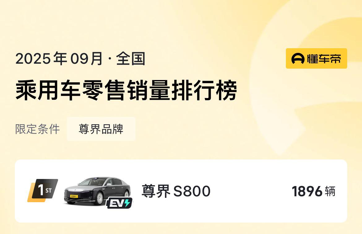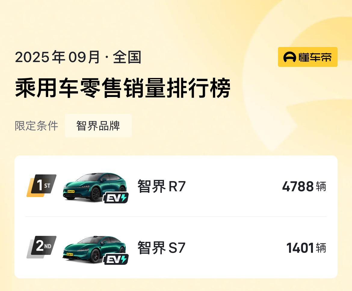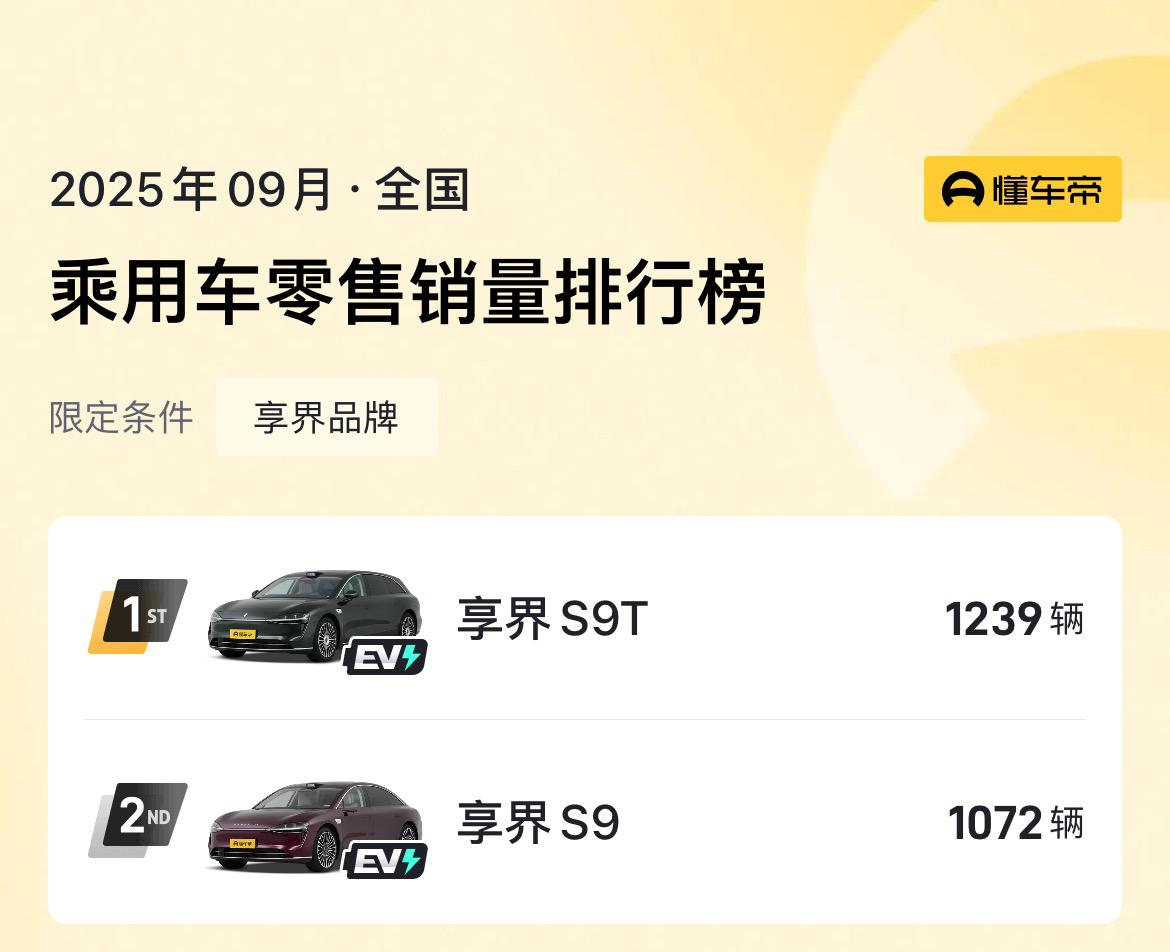 来看9月鸿蒙智行五界各车型的详细销量数据。 问界: M8 21244辆 M9 10503辆 M7 5970辆 M5 2902辆 智界: R7 4788辆 S7 1401辆 尊界: S800 1806辆 享界: S9T 1239辆 S9 1072辆 尚界: H5 1901辆 可以看到五界中问界独领风骚,M8和M9一个40万级一个50万级的车能卖这么好,羡煞旁人,M7后面也会起飞。 令人赞叹的是尊界S800,70万级销量一哥,打破BBA超豪华车型的统治。 智界表现还可以,享界怎么回事?【来自懂车帝车友圈】