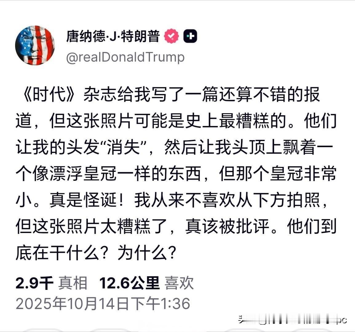 换个角度难道还能拍出你18岁?特朗普抱怨美国《时代》周刊选了一张他“史上最差的照片”当封面图。 特朗普在贴文中称,“他们‘抹去了’我的头发,然后在我头顶上方放了某种漂浮的东西,看起来像一顶漂浮的王冠,但却极小。真的很诡异!我从来就不喜欢仰拍的照片,这张照片实在太烂了,值得被点名批评。他们到底在干什么,为什么要这么做?”