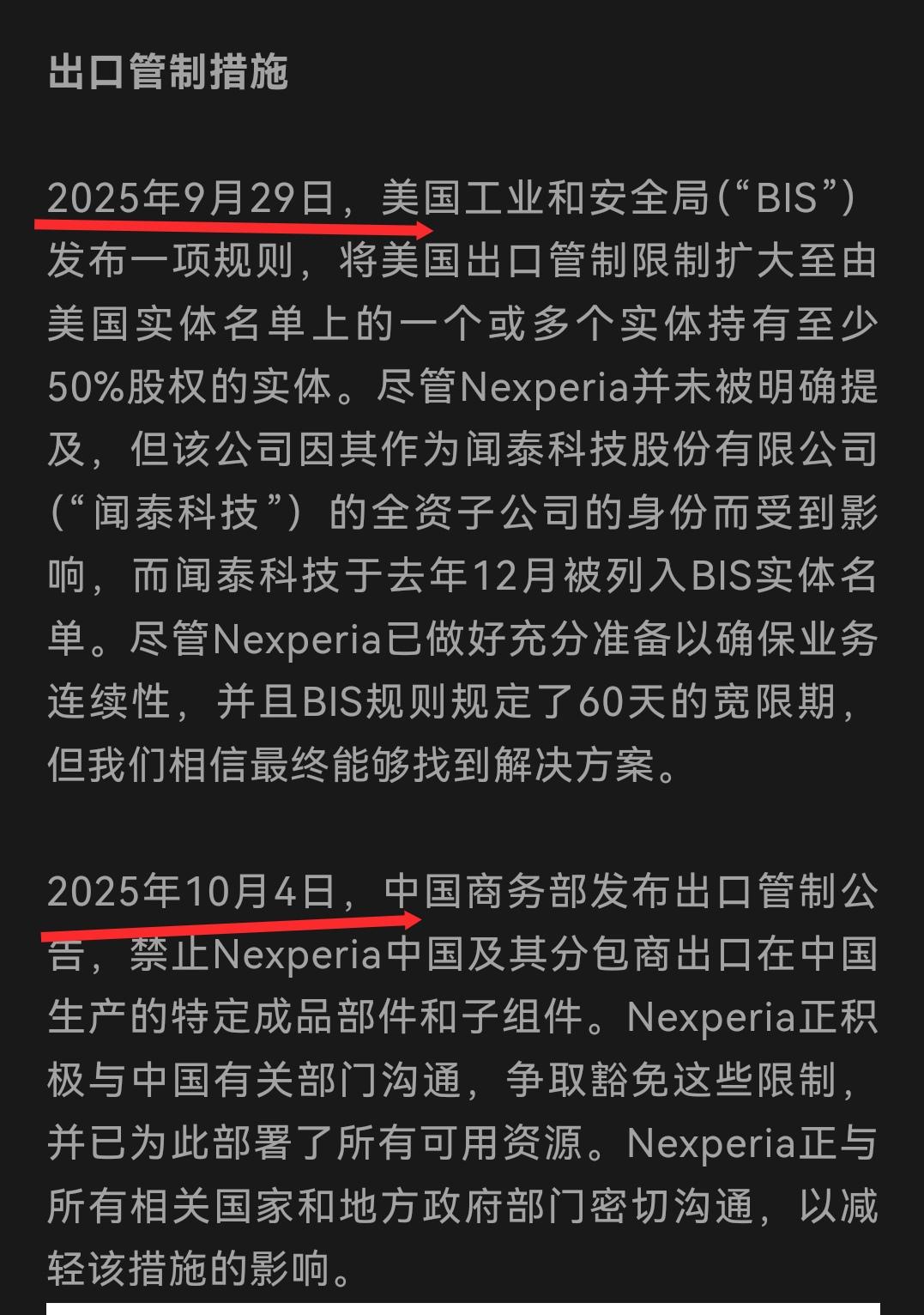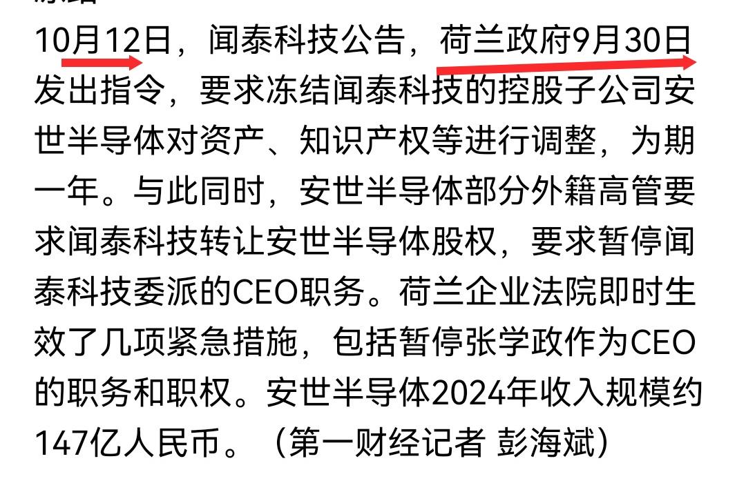 闻泰的公告隐瞒了重要信息:安世同时遭受了中美两国的制裁!换句话说,国家已经出手过了。 荷兰对安世的冻结发生在9月30,闻泰的公告在10月12日。理顺的时间线是这样的: 9月29日,美国制裁闻泰,点的是闻泰的名字,没提子公司安世。 9月30日,荷兰剥夺闻泰对安世的经营权,理由是为了避免被美国制裁。 10月4日,我国制裁安世。安世的研发在荷兰,但生产厂子在中国,我国的制裁对安世也是致命的。
