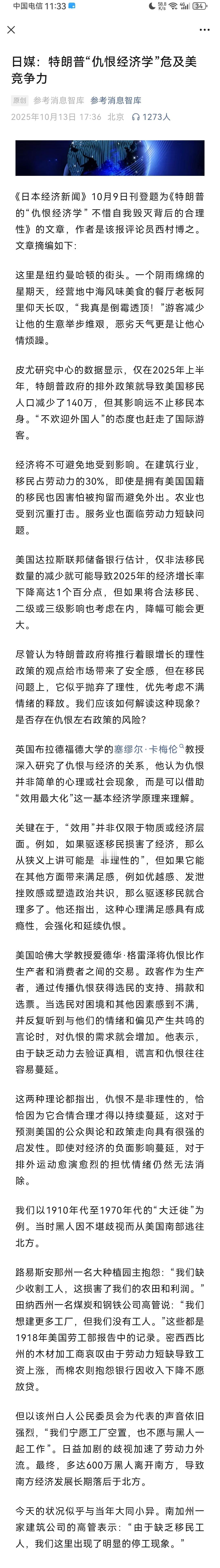 根据参考消息智库10月13日报道,《日本经济新闻》近日竟然发文,毫不留情批评特朗普盲目排外经济政策是“仇恨经济学”,最终结果只会让美国自我毁灭。 文章开头就用了很多翔实生动的具体事例,来说明特朗普经济政策所导致的各种负面结果,其推行的排外政策不仅导致美国移民人口减少,而且还使得来美国旅游的人口也急剧减少,游客减少导致很多以此为生的美国商家生意艰难; 接着是建筑业,因为外来移民变少,美国劳动力又不足,现在可以说遭受到了毁灭性打击; 接着是农业,与一般人想象中的不同,美国农业人口虽然很少,但是其需要的劳动力可一点也不少,在以往美国农场主都是靠雇佣外来移民来进行农业工作,但是现在外来移民减少,没了劳动力,美国农业也因此遭受到沉重打击; 还有服务业,支撑美国服务业的,依旧是外来移民,现在劳动力减少,美国的服务业也受到巨大挫折;等等,美国无数行业,都受到巨大冲击。 接着,文章更回顾了美国的历史,在美国的1910~1970年代,发生了一场黑人的“大迁徙”运动,在这个历史时期有将近600万黑人,从美国南方迁徙到北方,之所以如此,是因为南方的大庄园主,对黑人异常仇视苛刻。 最后导致的结果是南方一直缺少劳动力,无论是想要发展农业还是发展工业,都找不到足够数量的合格工人,最终美国南方的经济长期落后于北方。 现在整个美国的景象,都跟当年类似。 毕竟,外来移民有一个很重要的作用,就是充当劳动力,而没有了这些劳动力,美国企业的正常经营活动,都受到了巨大的冲击,有51%的美国企业经营者都认为打击移民将对其行业造成冲击,根据数据统计,美国过去三十年,移民及其子女,更是占有美国新增劳动力的三分之二,特朗普推行的排外的经济政策,最终导致的唯一结果,就是经济上的自我毁灭!