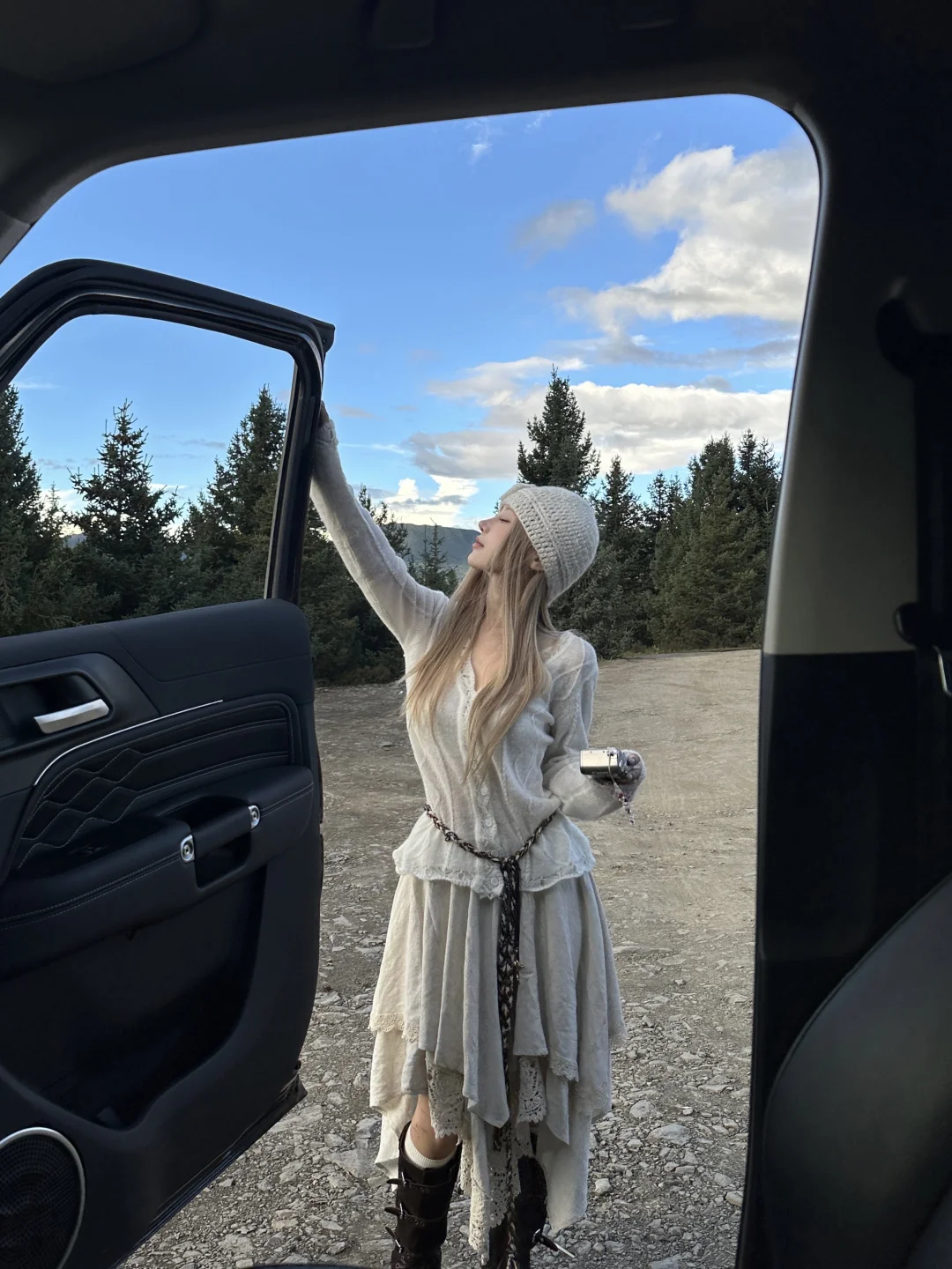 窗边的风裹着浅淡的光,裙摆随呼吸轻晃。黑衫露肩勾出松弛的软,紫蕾丝漫过膝弯,把日
