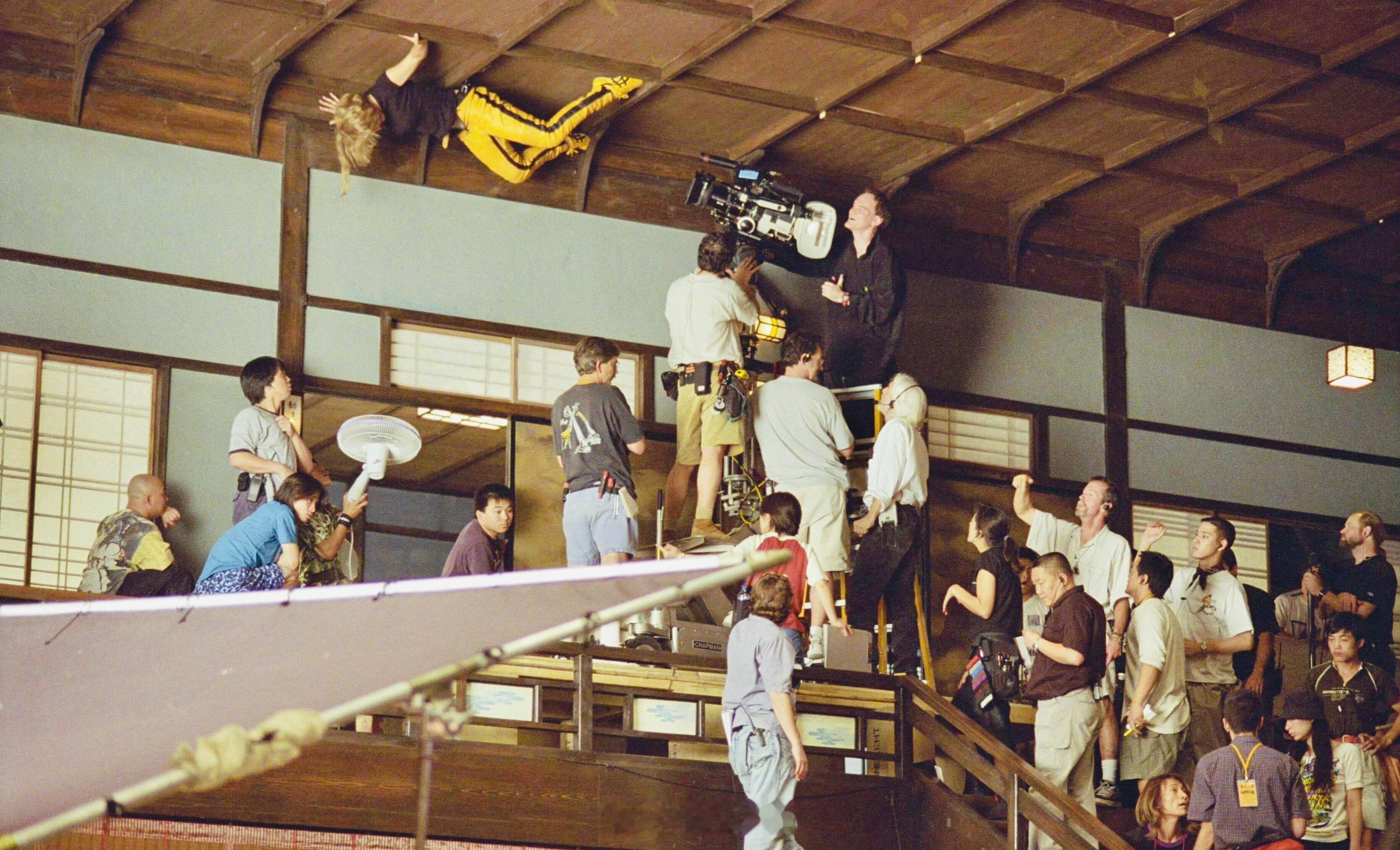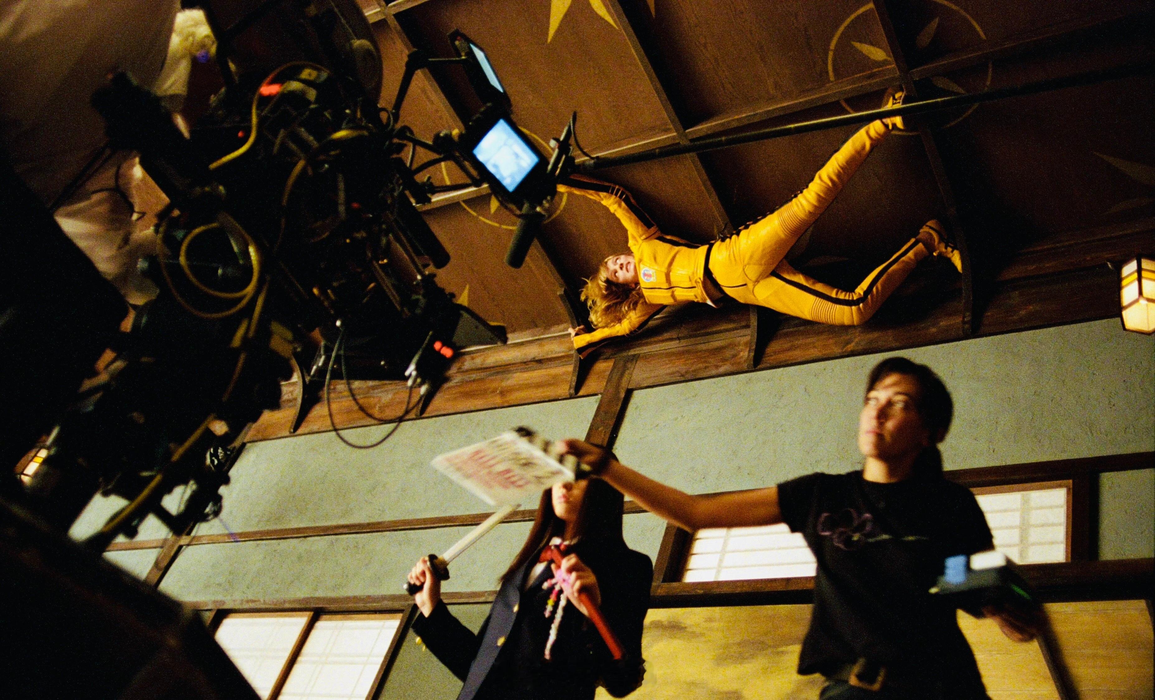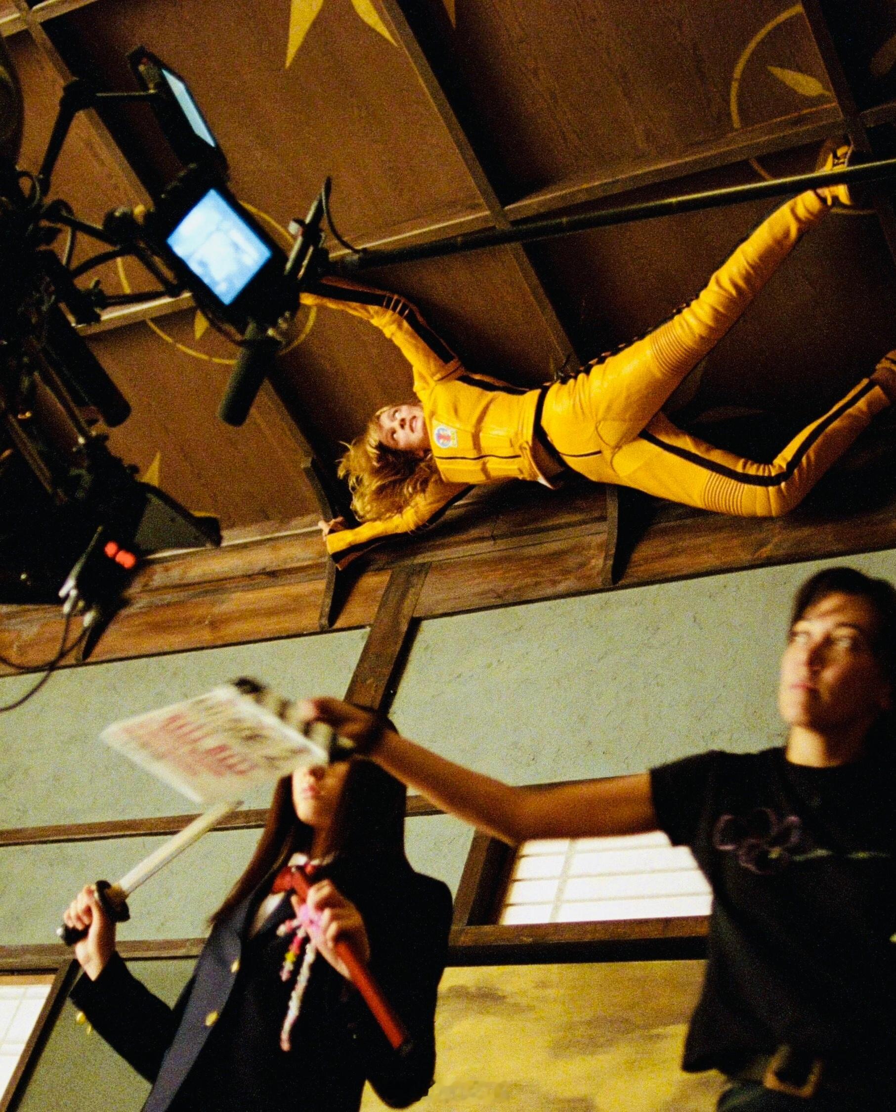电影[超话]搭乘花絮去幕后 复仇新娘的高光战力名场面[酷]——2003年【杀死比尔】片场,导演昆汀、栗山千明,还有腰部吊着威亚、挂在屋顶的乌玛·瑟曼!造浪吧国庆档 身穿致敬李小龙黑黄连身运动装的乌玛,尽显武林高手的飒飒身手,有蜘蛛侠那范儿了~🗡️🩸昆汀