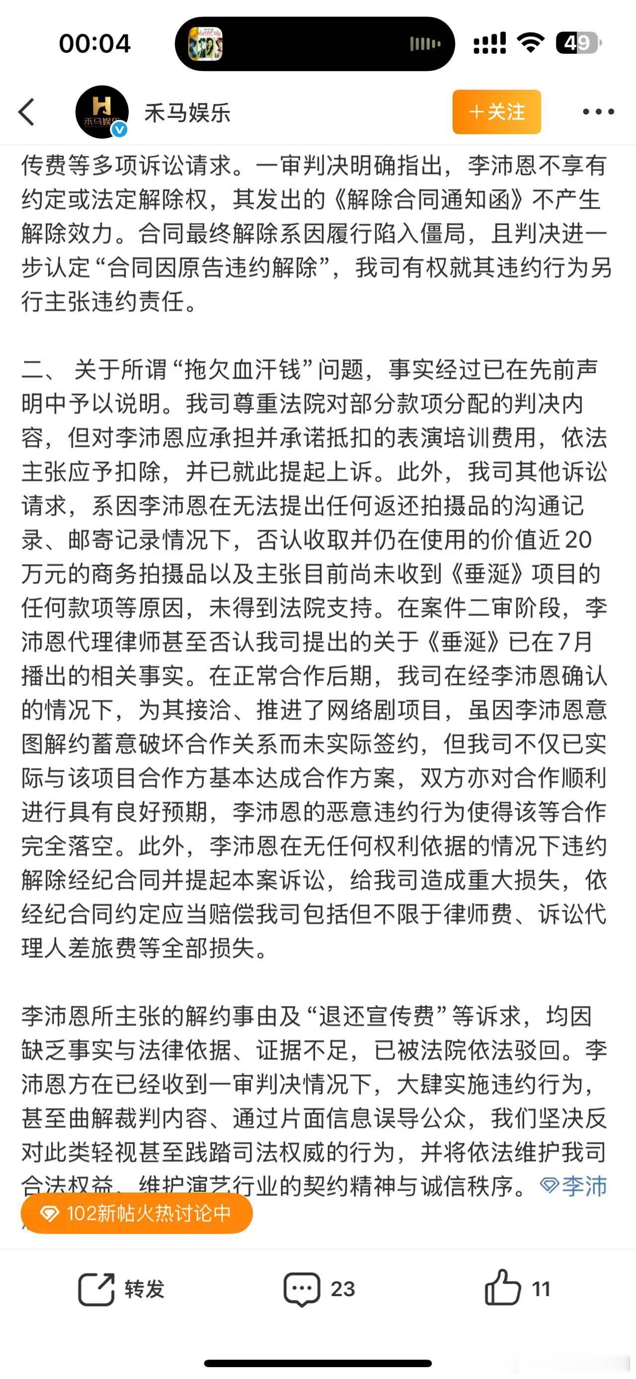 禾马娱乐又发文了,称李沛恩所谓的“基本全面胜利”和事实不符合,还解释了很多网传的