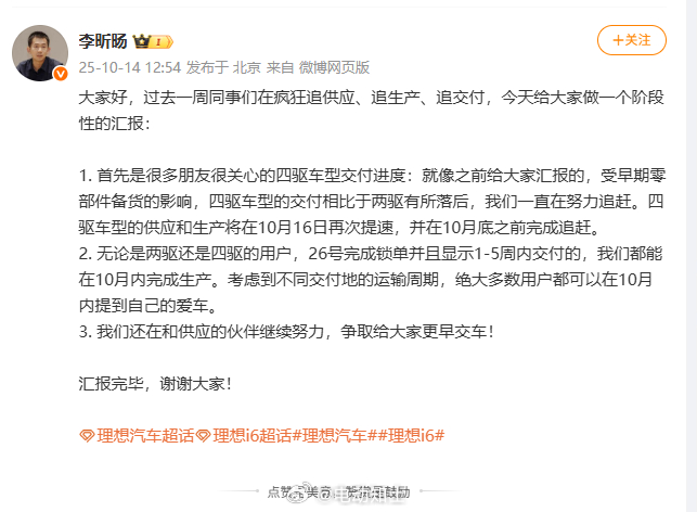 理想产品负责人同步了理想i6产能爬坡情况:四驱车型的供应和生产将在...