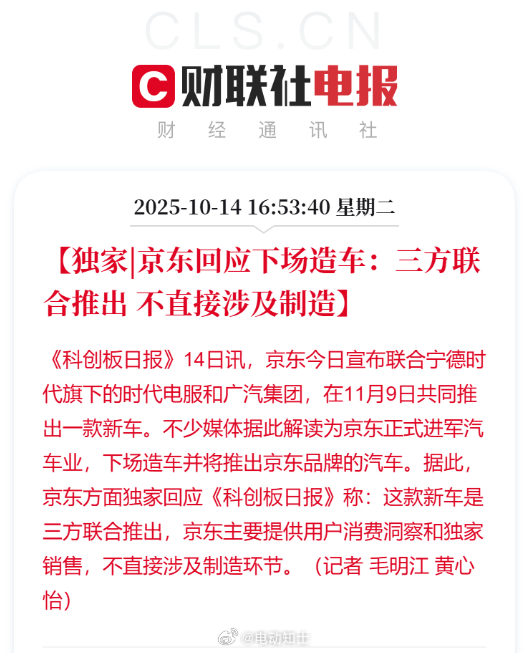 京东造车回应来了,这款新车是三方联合推出,京东主要提供用户消费洞察和独家销售,不直接涉及制造环节。
