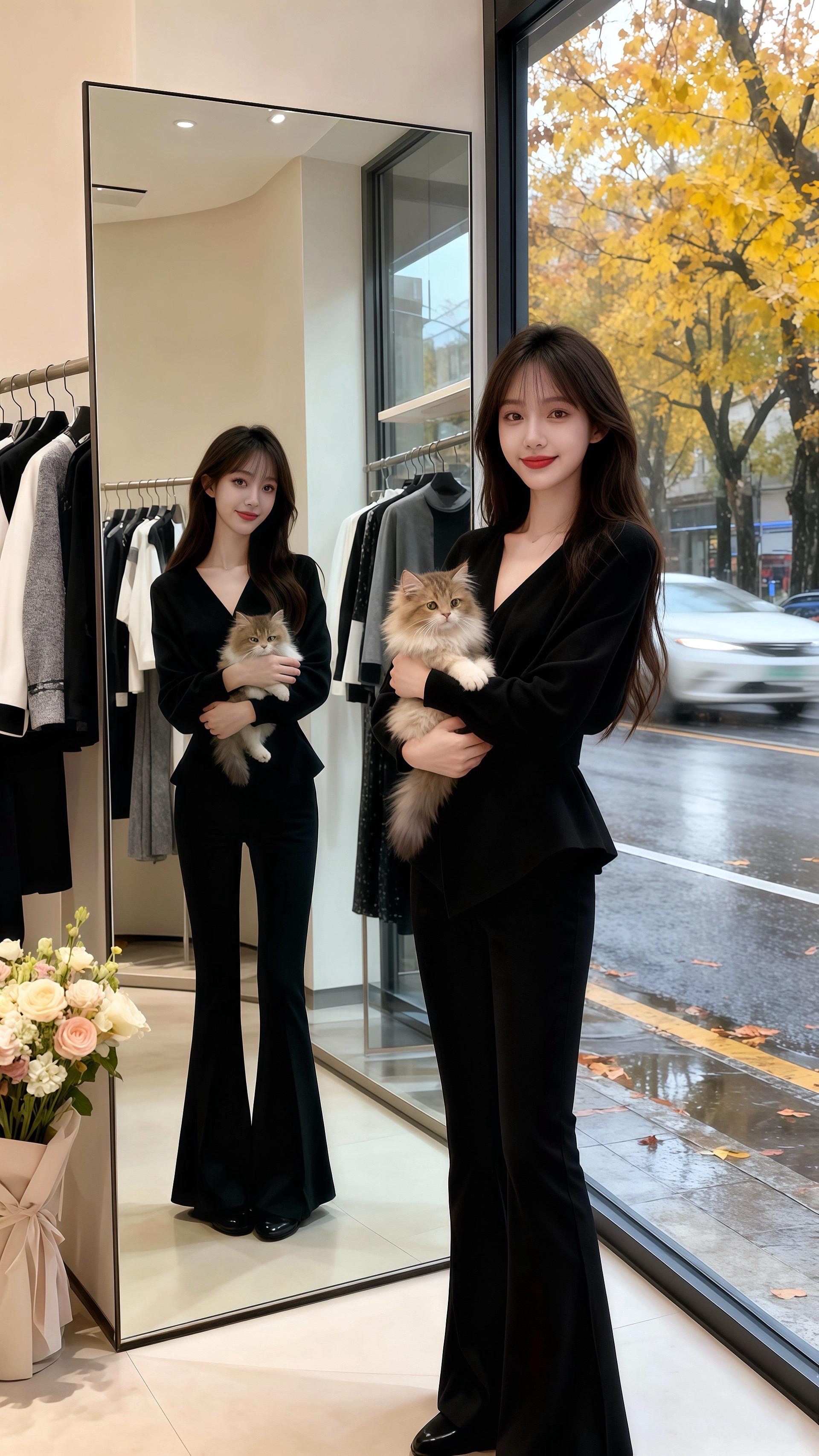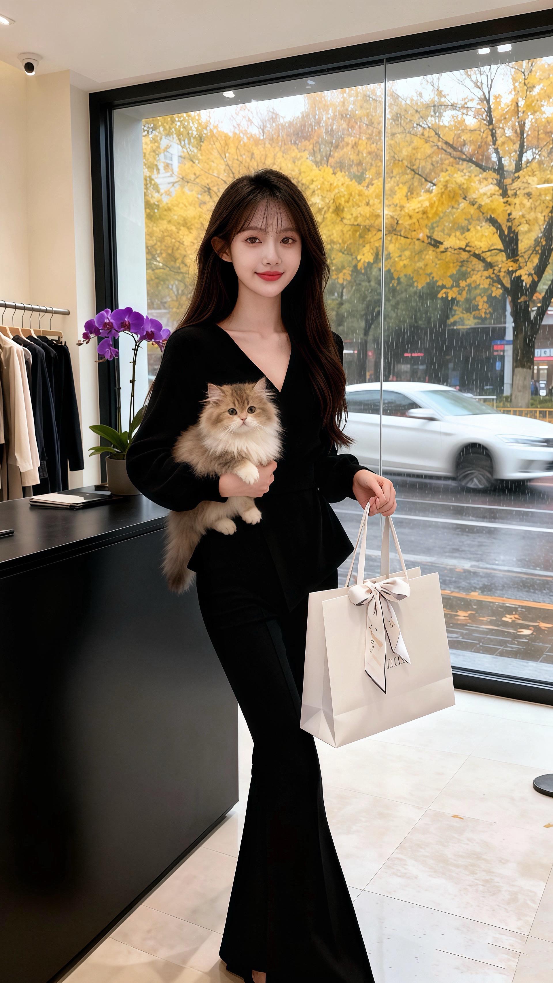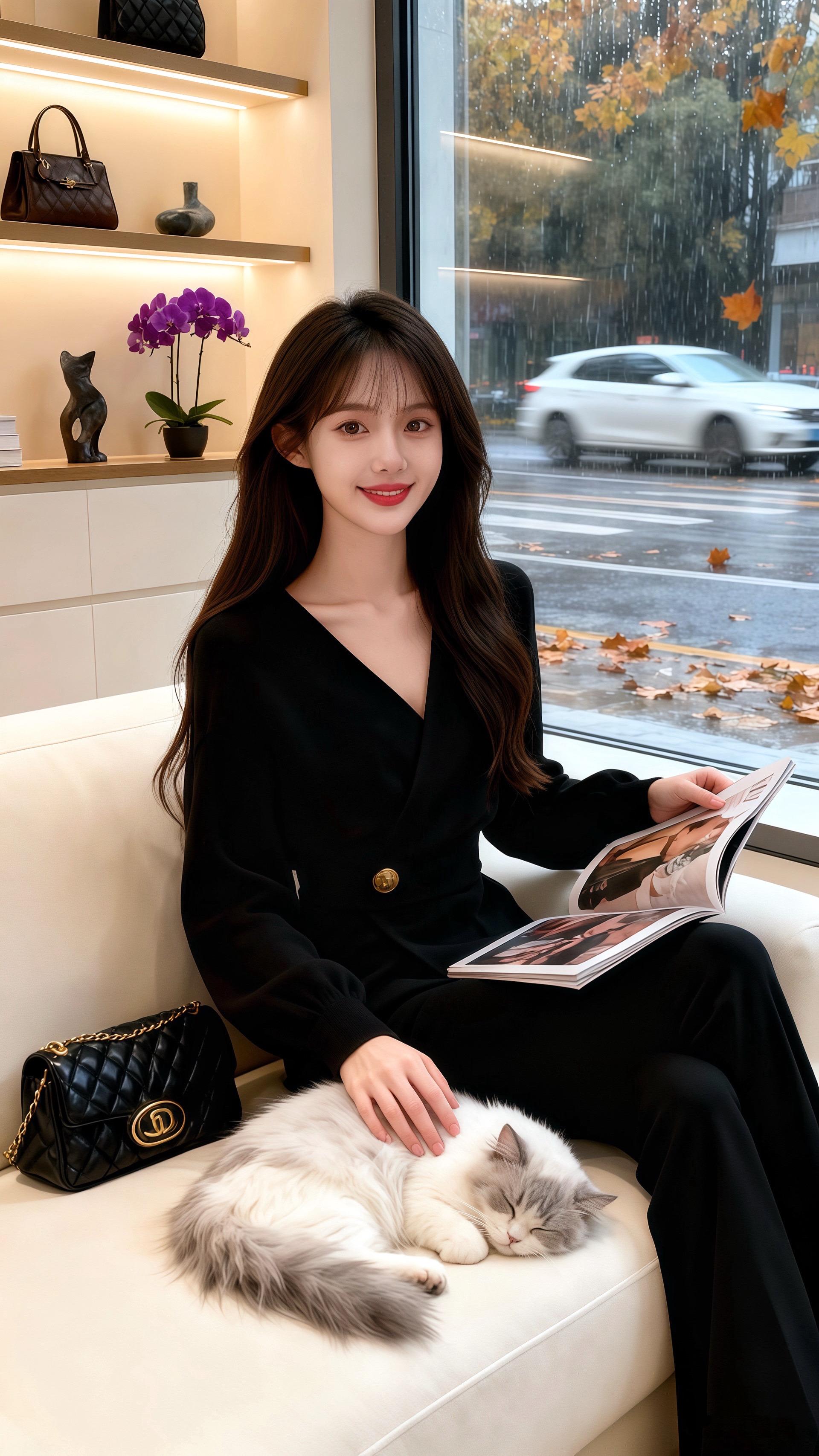 秋雨淅淅沥沥,打湿了街边的银杏叶。许妍抱着猫咪,站在服饰店落地窗前,一身黑色V领套装将她衬得优雅又干练。